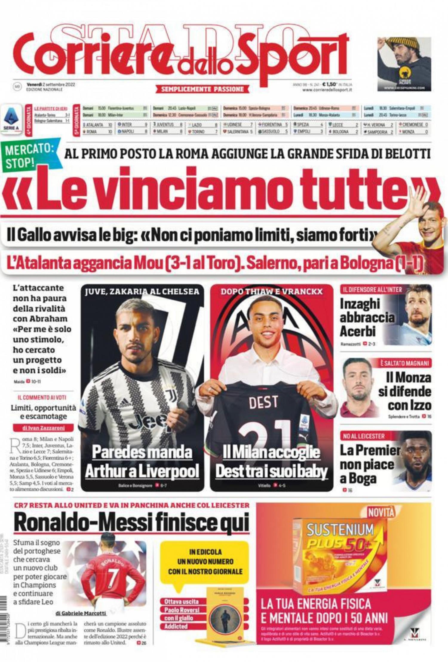 Il Corriere dello Sport apre in prima pagina con un'intervista di Belotti: "Le vinciamo tutte". Spazio anche al mercato delle varie squadra di A e ai due anticipi del quarto turno di campionato con la vittoria dell'Atalanta e il pareggio tra Bologna e Salernitana. In taglio basso spazio a Cristiano Ronaldo: "Ronaldo-Messi: finisce qui. CR7 resta allo United e va in panchina anche col Leicester".
