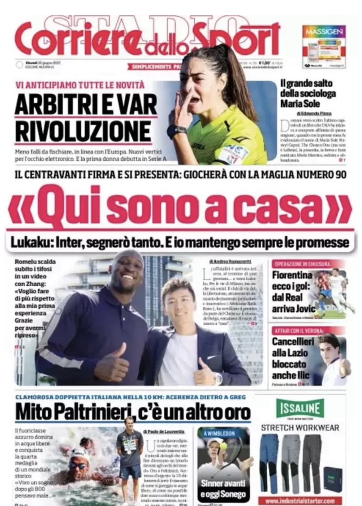 Il Corriere dello Sport apre in prima pagina con il ritorno all’Inter di Lukaku e le sue prime parole: “‘Qui sono a casa. Inter, segnerò tanto. E io mantengo sempre le promesse’”. In taglio alto si legge: “Arbitri, Var e rivoluzione”. Di spalla il colpo Jovic per la Fiorentina e la Lazio che si assicura Cancellieri.