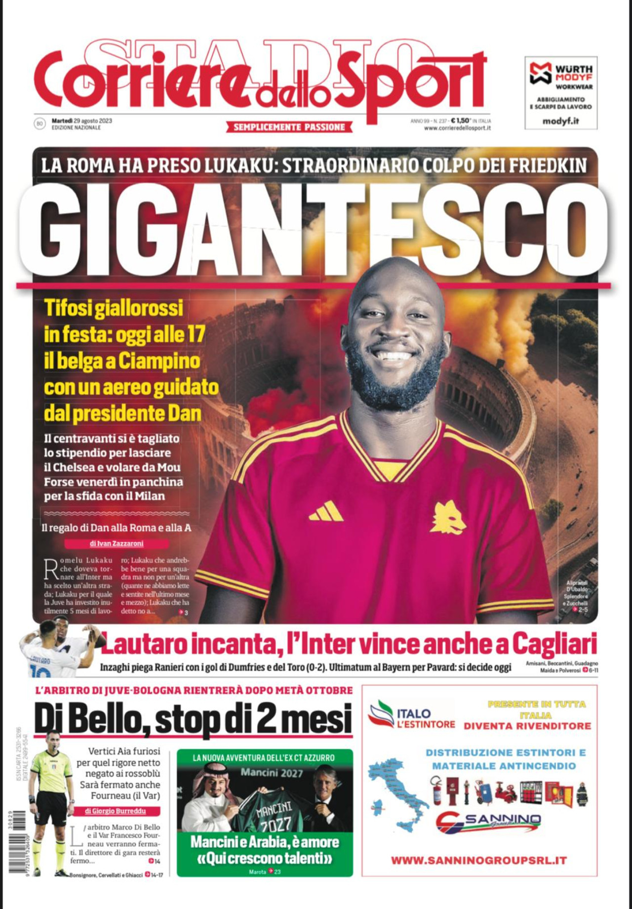 “Gigantesco”. Titola così al centro l’edizione odierna del Corriere dello Sport che apre in prima pagina con Romelu Lukaku alla Roma: "La Roma ha preso Lukaku: straordinario colpo dei Friedkin. Tifosi giallorossi in festa: oggi alle 17 il belga a Ciampino con un aereo guidato dal presidente Dan". Spazio anche al successo dell'Inter a Cagliari: "Lautaro incanta, l'Inter vince anche a Cagliari". In basso lo stop di 2 mesi all'arbitro Di Bello dopo il clamoroso rigore negato al Bologna nel match contro la Juventus.