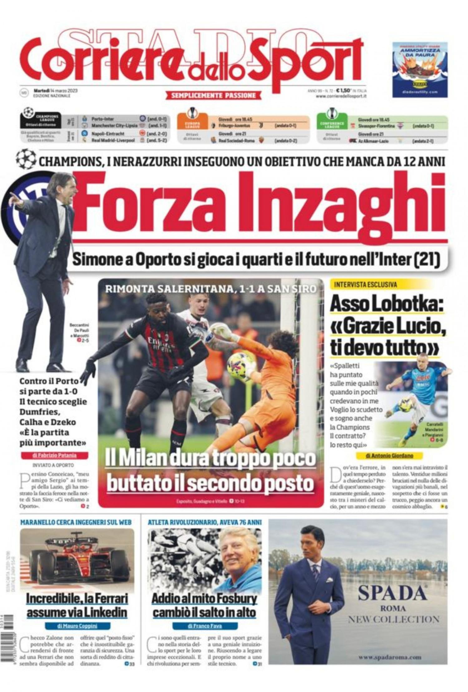 "Forza Inzaghi”. Titola così il Corriere dello Sport in prima pagina che apre con il ritorno di Champions League dell'Inter contro il Porto. Spazio anche al pareggio del Milan contro la Salernitana per 1-1: “Il Milan dura troppo poco, buttato il secondo posto”. Di spalla l'intervista di Lobotka: “Grazie Lucio, ti devo tutto. Spalletti ha puntato sulle mie qualità quando in pochi credevano in me. Voglio lo Scudetto e sogno anche la Champions. Il contratto? Io resto qui”.