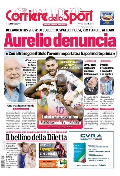 Il Corriere dello Sport, nell'edizione di oggi, apre in prima pagina con le parole di Aurelio De Laurentiis al Premio Bearzot vinto da Spalletti: "Aurelio denuncia. Con altre regole il titolo lo avremmo portato a Napoli molto prima". A centro pagina spazio alle qualificazioni a Euro 2024: "Lukaku fa tre gol a Ibra. Rabiot stende Wijnaldum”. In taglio basso spazio all'annuncio di Diletta Leotta: "Il bellino della Diletta".