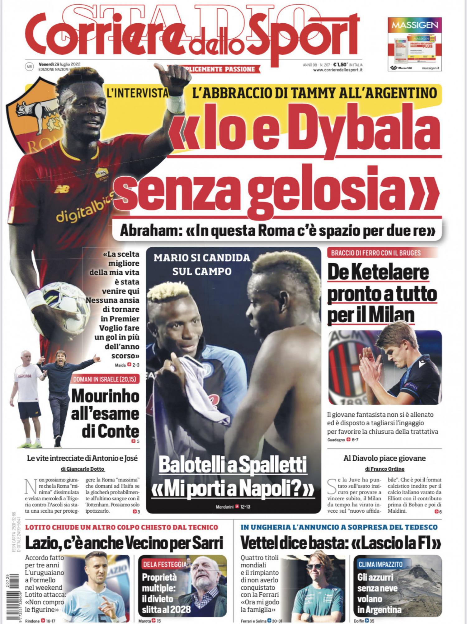 Il Corriere dello Sport apre in prima pagina con il Napoli e l'intervista a Mario Balotelli: "Balotelli a Spalletti: 'Mi porti a Napoli?'". In taglio alto l'intervista all'attaccante della Roma, Tammy Abraham: "Io e Dybala senza gelosia". Di spalla si parla del Milan: "De Keteleare pronto a tutto per il Milan". In taglio basso c'è la Lazio: "Lazio, c'è anche Vecino per Sarri". Spazio anche alle multiproprietà con: "DeLa festeggia. Proprietà multiple: il divieto slitta al 2028".