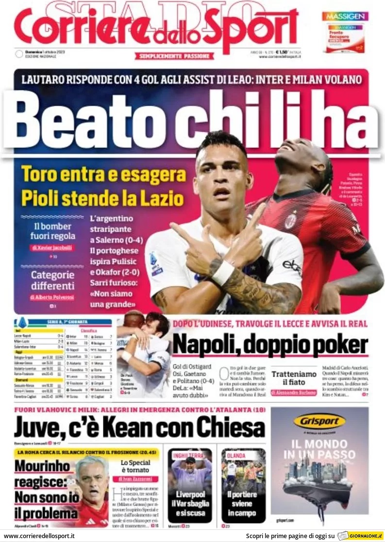 Nell'edizione di oggi, il Corriere dello Sport apre in prima pagina con le vittorie delle milanesi, trascinate da Lautaro e Leao: "Beato chi li ha". A centro pagina spazio al Napoli, che dopo l'Udinese asfalta anche il Lecce: "Doppio poker". In taglio basso la Juve, di scena oggi a Bergamo: "Juve, c'è Kean con Chiesa". Nel box in basso le parole di Mourinho che reagisce alle critiche: "Non sono io il problema".