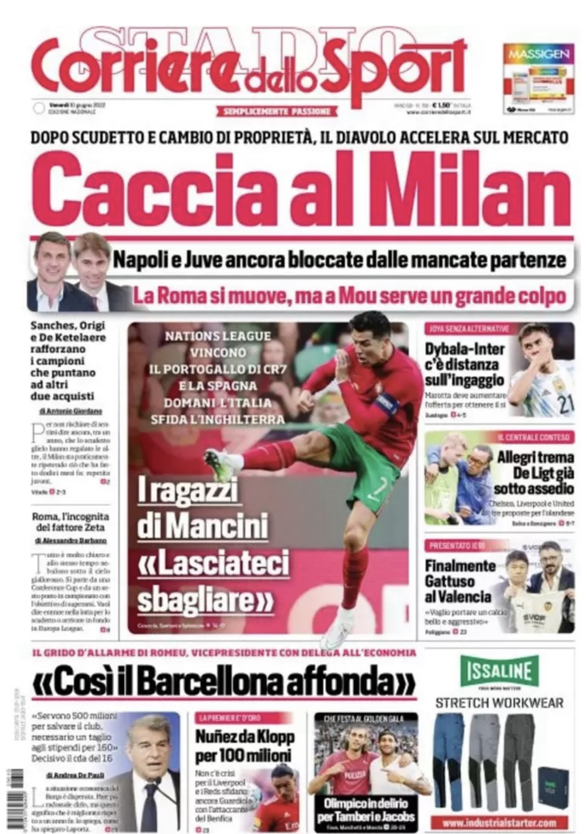 Il Corriere dello Sport apre in prima pagina con le manovre di mercato del Milan e non solo: “Caccia al Milan. Dopo scudetto e cambio di proprietà, il diavolo accelera sul mercato. Napoli e Juve bloccate dalle mancate partenze. La Roma si muove, ma a Mou serve un grande colpo". Al centro i risultati delle gare di Nations League e spazio all'Italia che domani sfiderà l'Inghilterra. Di spalla: "Dybala-Inter, c'è distanza sull'ingaggio". Sempre in taglio laterale si parla anche della Juventus e della conferenza stampa di presentazione di Gattuso al Valencia.