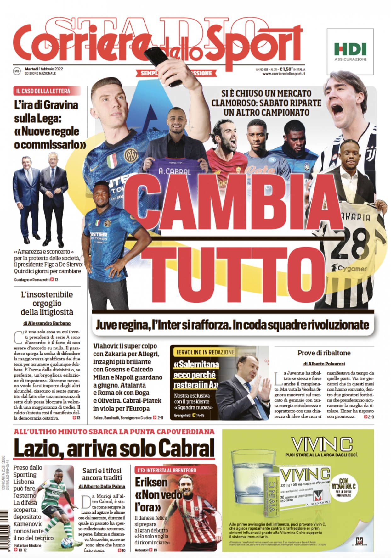 Il Corriere dello Sport apre in prima pagina con il calciomercato appena concluso: "Cambia tutto. Si è chiuso un mercato clamoroso: sabato riparte il campionato. Juve regina, l'Inter si rafforza. In coda squadre rivoluzionate". In taglio basso spazio alla Lazio: "Arriva solo Cabral", all'intervista al presidente della Salernitana e al ritorno in campo di Cristian Eriksen.