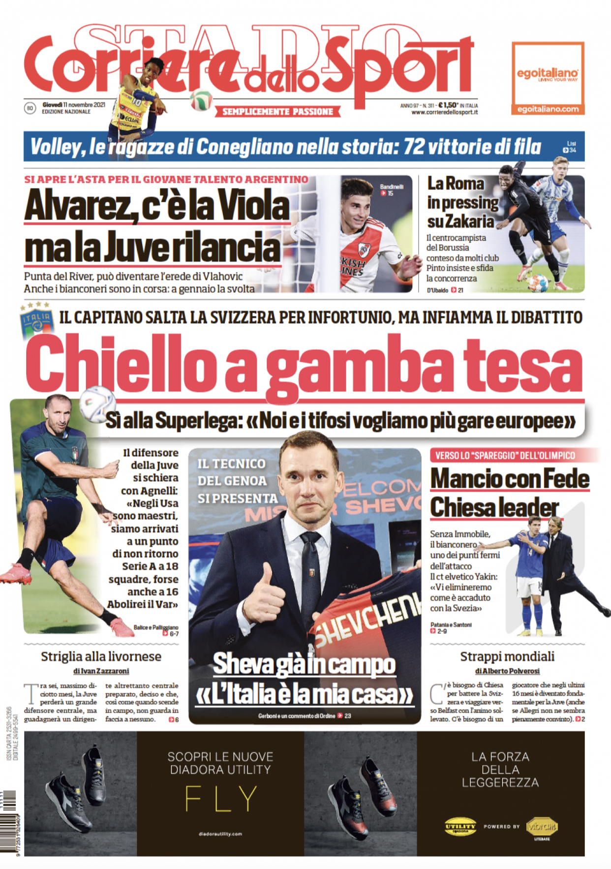 Il Corriere dello Sport apre in prima pagina con le parole del difensore della Juventus e della Nazionale sulla Superlega: "Chiello a gamba tesa. Il capitano salta la Svizzera per infortunio, ma infiamma il dibattito. Il difensore della Juve si schiera con Agnelli". In taglio alto il mercato: "Alvarez, c'è la Viola, ma la Juve rilancia". In spalla spazio alla nazionale: "Mancio con Fede Chiesa leader". Al centro la presentazione di Shevchenko al Genoa.