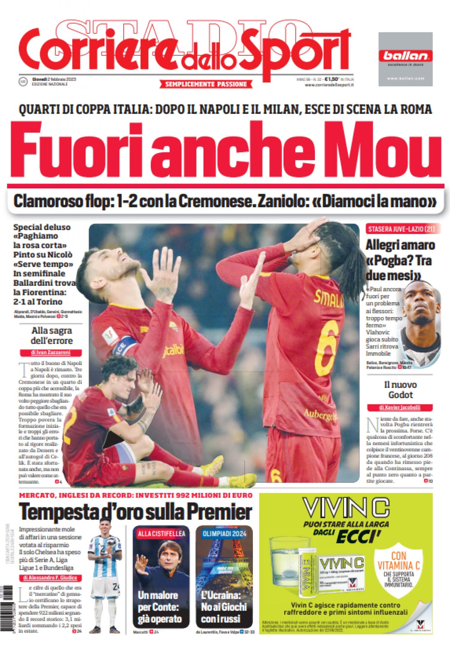 Nell'edizione di oggi, il Corriere dello Sport apre in prima pagina con l'eliminazione della Roma dalla Coppa Italia: "Fuori anche Mou. Clamoroso flop: 1-2 con la Cremonese. Zaniolo: 'Diamoci la mano'. Quarti di Coppa Italia: dopo il Napoli e il Milan, esce di scena la Roma". Di spalla spazio all'ennesimo stop di Pogba: "Allegri amaro: 'Pogba? Tra due mesi'". In taglio basso il mercato faraonico di gennaio della Premier League: "Tempesta d'oro sulla Premier".