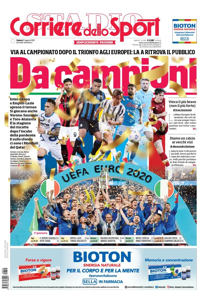 Il Corriere dello Sport apre in prima pagina con l'inizio della stagione di Serie A che prende oggi il via: "Da campioni. Via al campionato dopo il trionfo agli Europei: la A ritrova il pubblico. Inter-Genoa e Empoli-Lazio aprono il torneo. Si giocano anche Verona-Sassuolo e Toro-Atalanta. E' la stagione del riscatto dopo l'incubo della pandemia. E sullo sfondo ci sono i mondiali in Qatar".