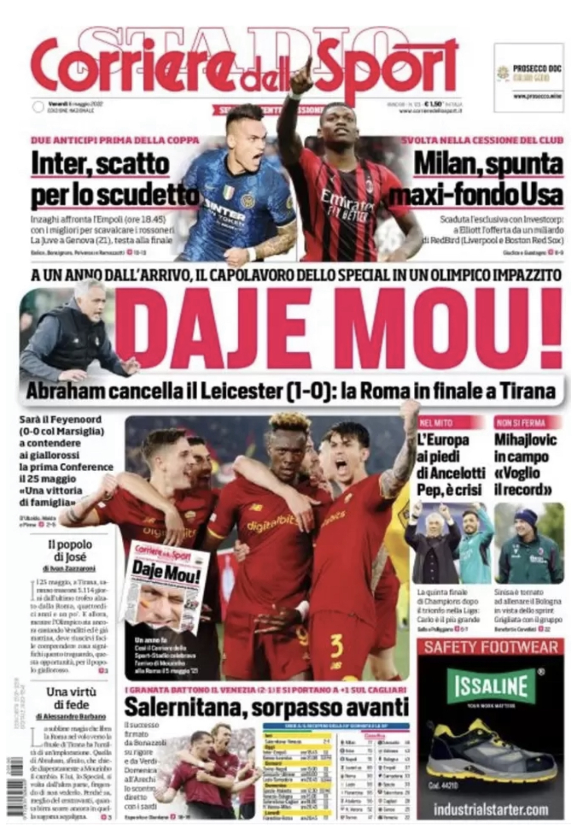 Il Corriere dello Sport apre in prima pagina con la Roma: "Daje Mou! A un anno dall'arrivo, il capolavoro dello Special in un Olimpico impazzito. Abraham cancella il Leicester: la Roma in finale a Tirana". In taglio alto: "Inter, scatto per lo Scudetto", "Milan, spunta maxi-fondo Usa". In taglio basso la preziosissima vittoria della Salernitana contro il Venezia: "Salernitana, sorpasso avanti".
