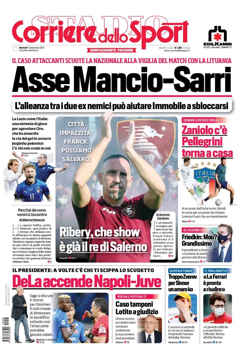 Il Corriere dello Sport apre in prima pagina con le parole di De Laurentiis dichiarate nel pre-partita dell'amichevole con il Benevento: “DeLa accende Napoli-Juve. Il presidente: a volte c'è chi ti scippa lo scudetto. Oggi si discute il ricorso per Osimhen. Il club chiede di dimezzare la squalifica: soltanto così l'attaccante potrebbe giocare sabato". "Asse Mancio-Sarri", al centro si parla dell'alleanza tra i due allenatori per rilanciare Ciro Immobile in Nazionale. L'arrivo di Ribery alla Salernitana: "Ribery, che show, è già il re di Salerno". Sulla destra le ipotesi di formazione e i rientri in casa Italia in vista del match di domani.