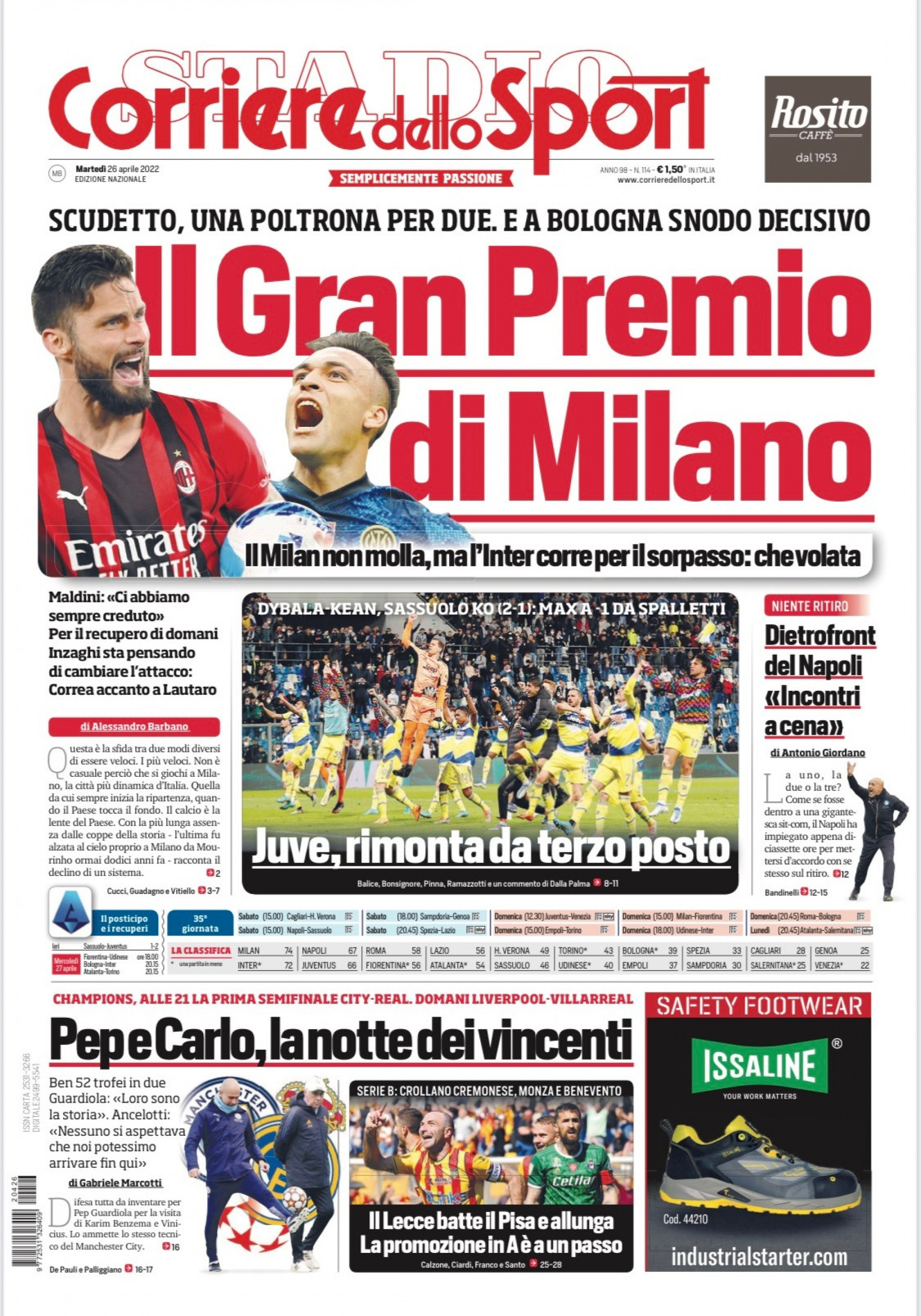 Il Corriere dello Sport apre in prima pagina con la decisione del Napoli: "Niente ritiro. Dietrofront del Napoli. 'Incontri a cena'". In taglio alto spazio alla lotta scudetto tra Milan e Inter: "Il Gran premio di Milano". Al centro il successo della Juve: "Dybala-Kean, Sassuolo ko: Max a -1 da Spalletti". In taglio basso spazio alla Champions: "Per e Carlo, la notte dei vincenti". Spazio anche alla Serie B: "Il Lecce batte il Pisa e allunga. La promozione in A è a un passo".