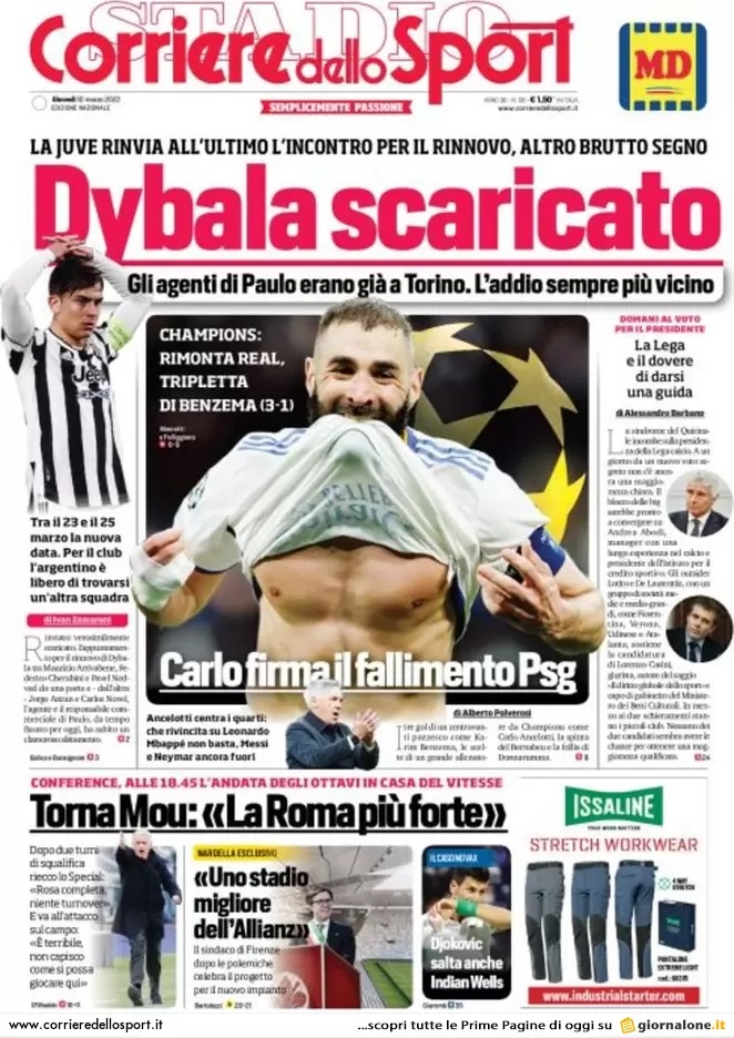 Nell'edizione di oggi il Corriere dello Sport apre in prima pagina con il rinvio dell'incontro tra la Juventus e Dybala per il rinnovo del contratto dell'argentino: "Dybala scaricato. Gli agenti di Paulo erano già a Torino. L'addio sempre più vicino". A centro pagina spazio all'incredibile rimonta del Real Madrid in Champions League: "Carlo firma il fallimento del Psg". In taglio basso spazio alle dichiarazioni di Mourinho prima dell'ottavo di finale di Conference League: "La Roma più forte".