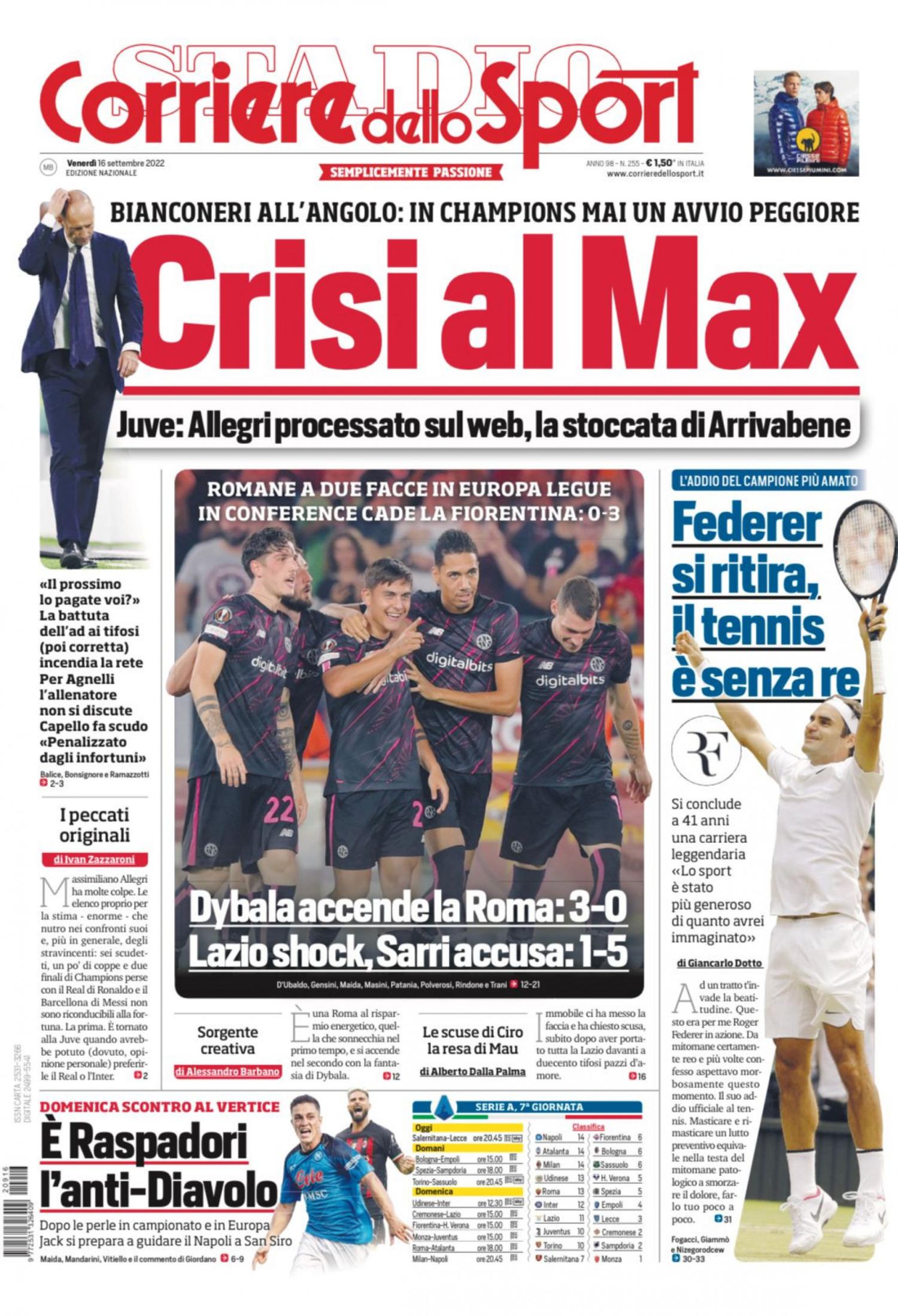 “E’ Raspadori l’anti-Diavolo”. Titola così in taglio basso l’edizione odierna del Corriere dello Sport. "Domenica scontro al vertice. Dopo le perle in campionato e in Europa, Jack si prepara a guidare il Napoli a San Siro". Taglio alto dedicato alla crisi della Juventus: "Crisi al Max". Al centro i risultati delle italiane in Europa con la vittoria della Roma e le brutte e pesanti sconfitte di Lazio e Fiorentina. Di spalla l'annuncio di Roger Federer che a 41 anni si ritira dal tennis.