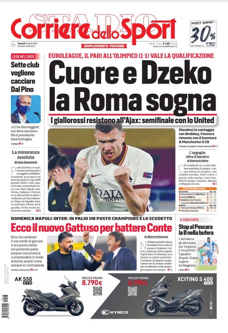 "Cuore e Dzeko, la Roma sogna". I giallorossi di Fonseca passano il turno contro l'Ajax e si preparano ad affrontare il Manchester United nelle semifinali di Europa League. Poi il caos in Lega con sette club che vorrebbero cacciare Dal Pino.