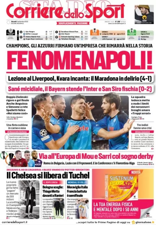 Nell'edizione di oggi il Corriere dello Sport apre in prima pagina con l'exploit del Napoli in Champions League: "FenomeNapoli! Lezione al Liverpool, Kvara incanta: il Maradona in delirio (4-1). Doppio Zielinski: rigore e gol finale. Anche Anguissa e Simeone a rete. Spalletti felice: 'Noi siamo così'". A centro pagina spazio alla sconfitta interna dell'Inter contro il Bayern Monaco: "Sané micidiale, il Bayern stende l'Inter e San Siro fischia (0-2). Più in basso l'esordio europeo delle romane: "Via all'Europa di Mou e Sarri col sogno derby".