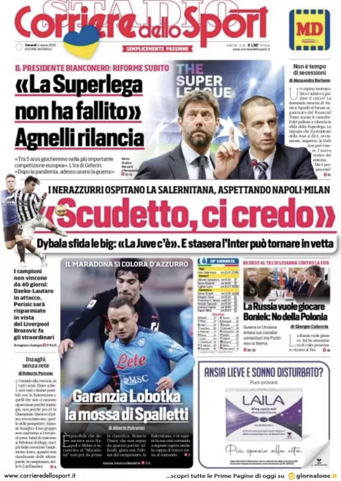 Il Corriere dello Sport apre in prima pagina con la gara di domenica tra Napoli e Milan: "Il Maradona si colora d'azzurro. Garanzia Lobotka, la mossa di Spalletti". In taglio alto le parole del presidente della Juventus, Andrea Agnelli, in merito alla Superlega: "'La Superlega non ha fallito' Agnelli rilancia". Al centro ampio spazio alle parole di Dybala sullo Scudetto e all'impegno dell'Inter contro la Salernitana.
