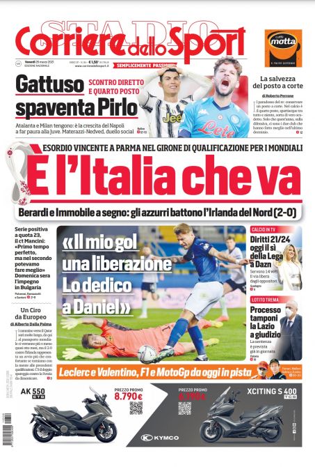 Il Corriere dello Sport apre in prima pagina con lo duello per il quarto posto tra Napoli e Juventus: “Gattuso spaventa Pirlo”. Al centro spazio alla vittoria dell'Italia: "È l'Italia che va", a segno Berardi e Immobile che piegano l'Irlanda del Nord nella prima partita valida per il girone di qualificazione per i Mondiali. Poi spazio alla battaglia sui diritti tv e alla sentenza prevista in giornata per la Lazio: "Processo tamponi, la Lazio a giudizio".