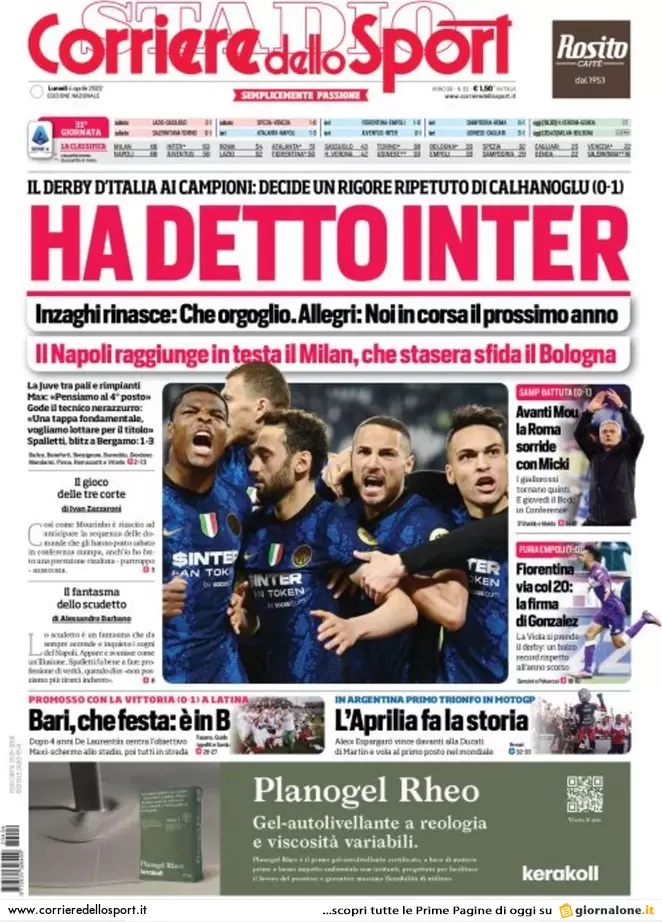 Nell'edizione di oggi, il Corriere dello Sport apre in prima pagina con la vittoria dell'Inter nel derby d'Italia contro la Juventus: "Ha detto Inter. Inzaghi rinasce: Che orgoglio. Allegri: Noi in corsa il prossimo anno". A centro pagina spazio al Napoli, vittorioso a Bergamo contro l'Atalanta: "Il Napoli raggiunge in testa il Milan, che stasera sfida il Bologna". In taglio basso spazio al Bari di De Laurentiis che torna in Serie B: "Bar, che festa: è in B".