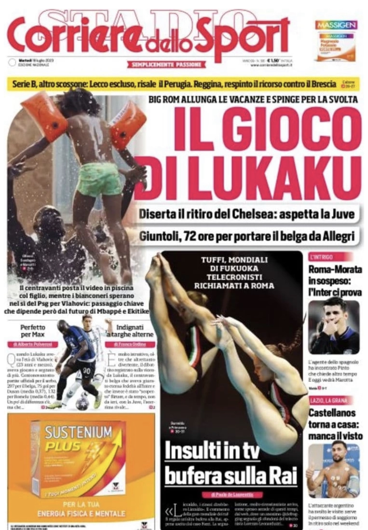 “Il gioco di Lukaku”. Titola così in taglio alto l’edizione odierna del Corriere dello Sport: “Big Rom allunga le vacanze e spinge per la svolta. Diserta il ritiro del Chelsea: aspetta la Juve. Giuntoli, 72 ore per portare il belga da Allegri”. Di spalla: “Roma-Morata in sospeso: l’Inter ci prova”.