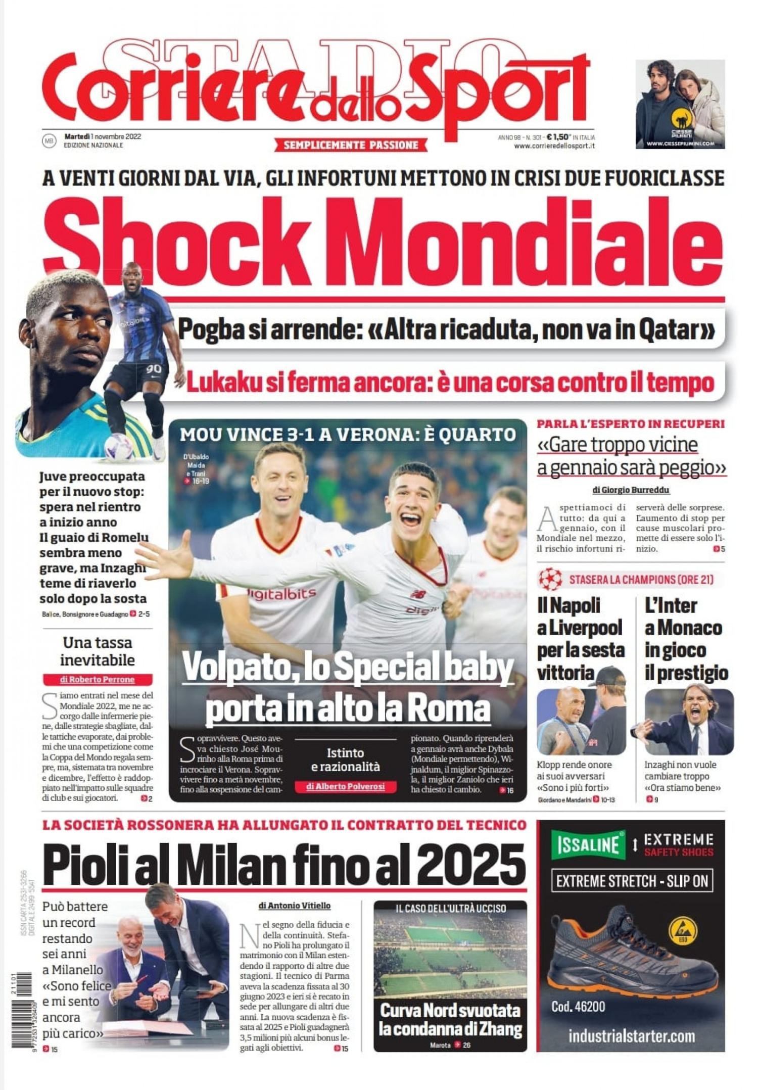 "Il Napoli a Liverpool per la sesta vittoria”. Titola così di spalla l’edizione odierna del Corriere dello Sport. “Klopp rende onore ai suoi avversari: ‘Sono i più forti’”. Al centro l’apertura è dedicata all'infortunio di Paul Pogba, costretto a saltare i Mondiali in Qatar: "Shock Mondiale". In taglio centrale invece spazio alla vittoria della Roma: "Volpato, lo Special Baby porta in alto la Roma". In basso, spazio al rinnovo di Pioli: "Pioli al Milan fino al 2025”. Di spalla, oltre al Napoli, si parla di Champions: “L’Inter a Monaco: in gioco il prestigio".