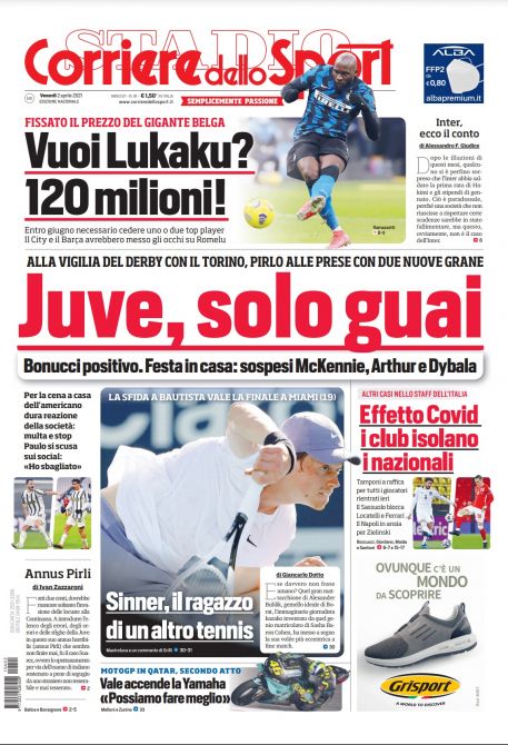 Il Corriere dello Sport apre in prima pagina con l'allarme Covid in casa Napoli: “Il Napoli in ansia per Zielinski”. Spazio poi ai problemi in casa Juventus in vista del derby contro il Torino: "Juve solo guai. Bonucci positivo. Festa in casa: sospesi Mckennie, Arthur e Dybala". Nel taglio alto l'Inter fissa il prezzo sul gigante belga: "Vuoi Lukaku? 120 milioni!". Spazio anche al Sassuolo che isola i propri calciatori di ritorno dalla nazionale.