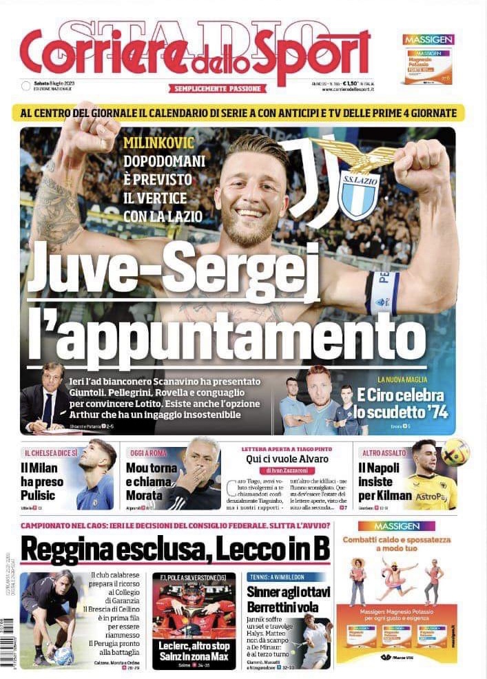 “Il Napoli insiste per Kilman”. Titola così in taglio basso l’edizione odierna del Corriere dello Sport in riferimento alla caccia al sostituto di Kim. Al centro ampio spazio alle prime parole di Giuntoli e al mercato della Juventus: "Juve-Sergej, l'appuntamento". Si parla anche del Milan e del nuovo acquisto Pulisic.