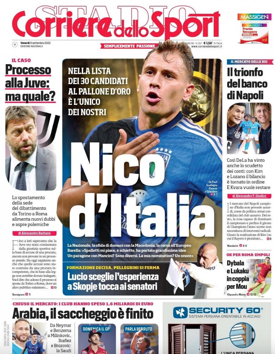 "Il trionfo del banco di Napoli" titola di spalla il Corriere dello Sport in merito allo Scudetto anche dei conti per il Napoli: con Kim e Lozano il bilancio è tornato in ordine. E Kvara vuole restare. L'apertura è per "Nico d'Italia", Barella, l'unico italiano nei 30 del Pallone d'Oro".