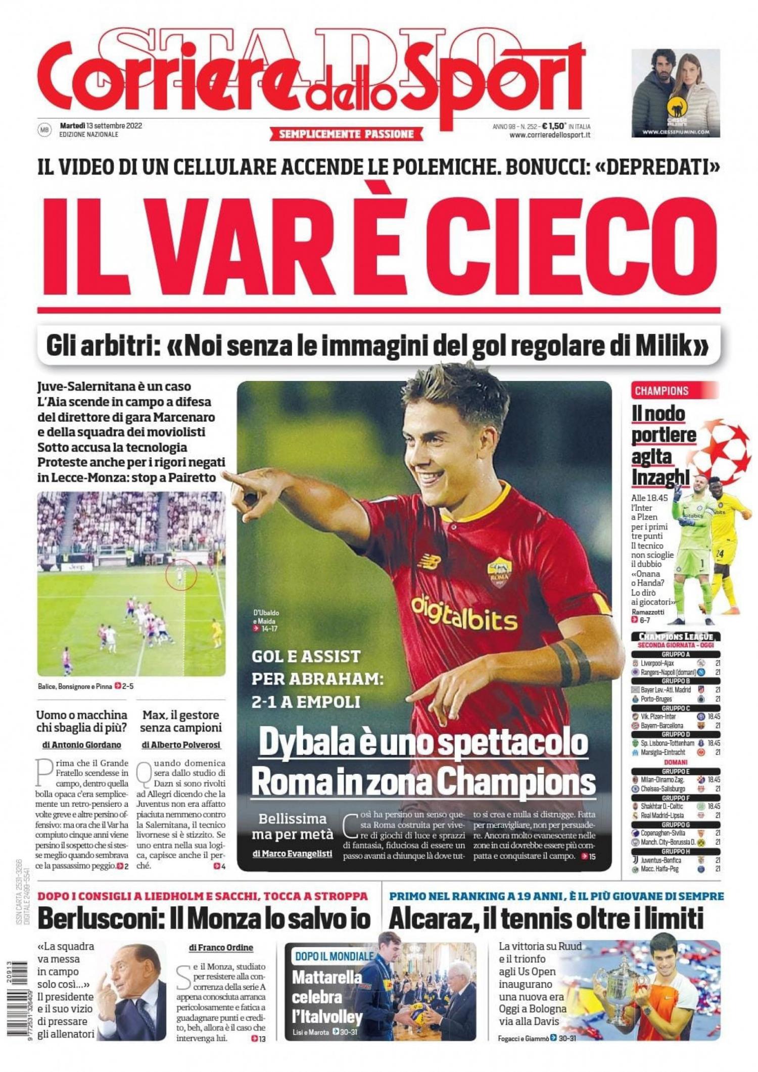 Il Corriere dello Sport apre in prima pagina con i fatti di Juve-Salernitana: "Il Var è cieco". Taglio centrale per la vittoria della Roma a Empoli: "Dybala è uno spettacolo. Roma in zona Champions". Di spalla la Champions: "Il nodo portiere agita Inzaghi". In taglio basso spazio al Monza: "Berlusconi: Il Monza lo salvo io".