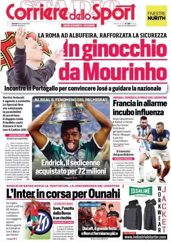 Nell'edizione di oggi il Corriere dello Sport apre in prima pagina con il pressing del Portogallo per convincere Mourinho ad accettare l'incarico di ct: "In ginocchio da Mourinho". A centro pagina spazio al nuovo acquisto del Real Madrid: "Endrick, il sedicenne acquistato per 72 milioni". Di spalla il virus che preoccupa la Francia in Qatar: "Francia in allarme, incubo influenza". In taglio basso spazio al mercato dell'Inter: "L'Inter in corsa per Ounahi"