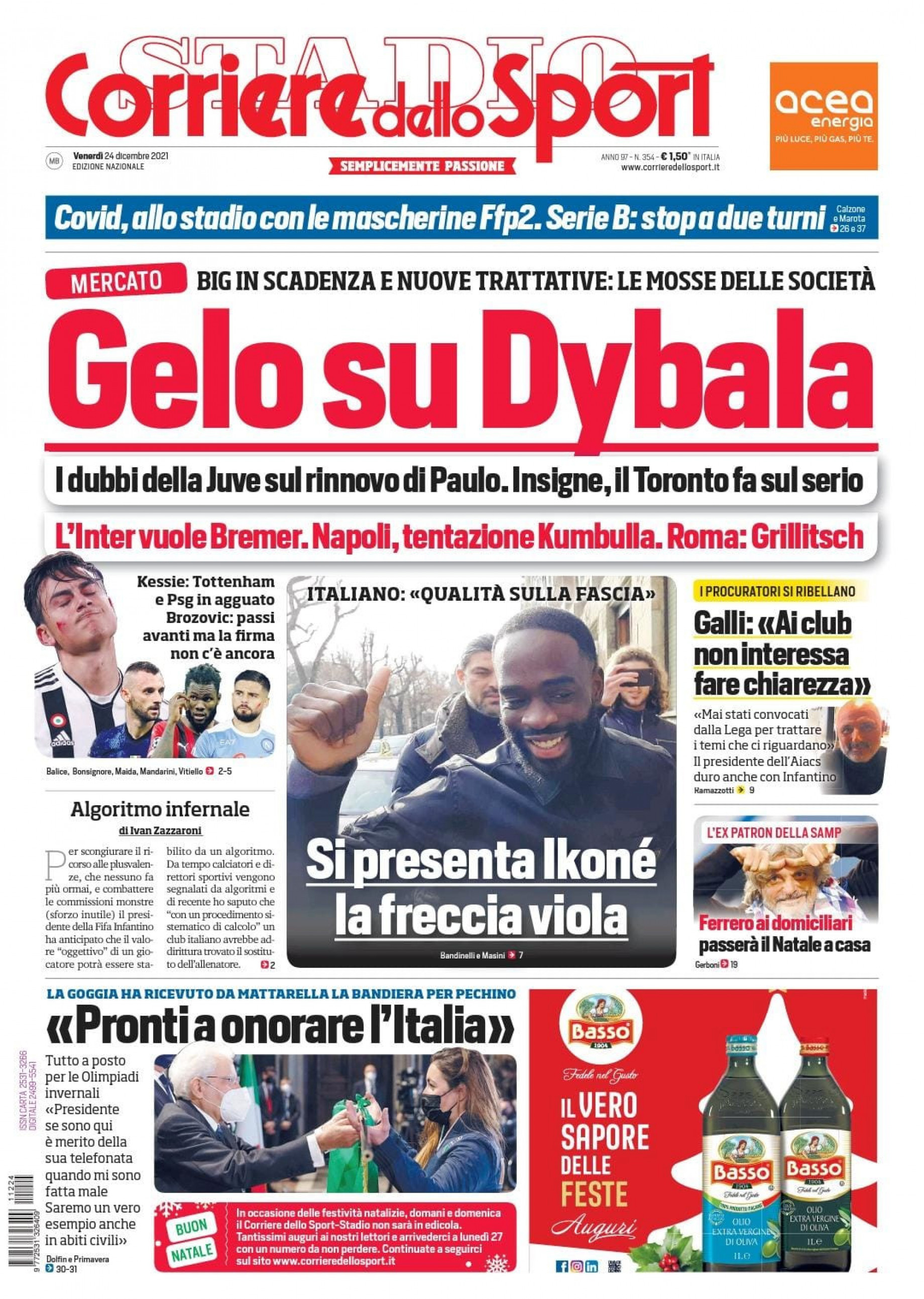 Il Corriere dello Sport apre in prima pagina con il calciomercato delle squadre di Serie A: "Big in scadenza e nuove trattative: le mosse dele società. Gelo su Dybala. I dubbi della Juve sul rinnovo di Dybala. Insigne, il Toronto fa sul serio. L'Inter vuole Bremer. Napoli, tentazione Kumbulla. Roma: Grillitsch. Kessie: Tottenham e PSG in agguato. Brozovic: passi avanti ma la firma non c'è ancora". In taglio alto le nuove misure del governo per gli stadi e al centro il nuovo colpo di mercato della Fiorentina.