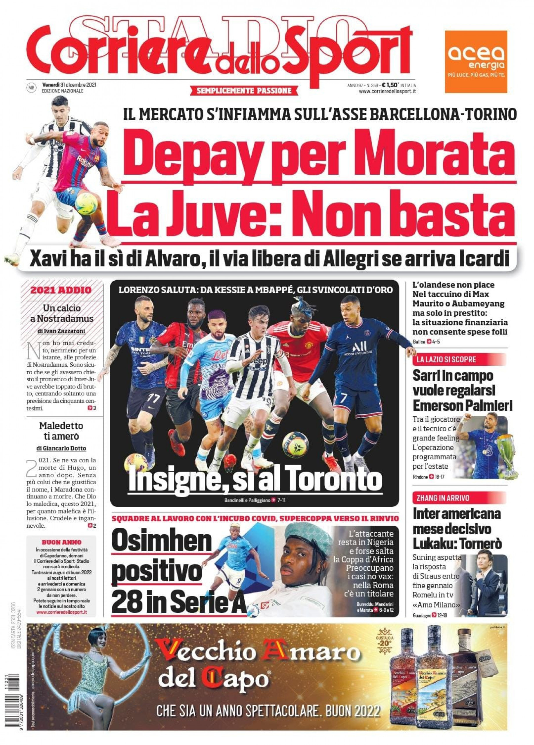 Il Corriere dello Sport apre in prima pagina con il caso Insigne e con il futuro del capitano azzurro sempre più distante dall’Italia: “Insigne, sì al Toronto. Lorenzo saluta: da Kessie a Mbappè, gli svincolati d'oro”. Più in basso spazio alla positività al Covid-19 di Osimhen e ai positivi in Serie A: "L'attacccante resta in Nigeria e forse salta la Coppa d'Africa. Preoccupano i casi no-vax: nella Roma c'è un titolare". In alto spazio al calciomercato e all'asse caldo Madrid-Barcellona-Torino: "Depay per Morata. La Juve: non basta".