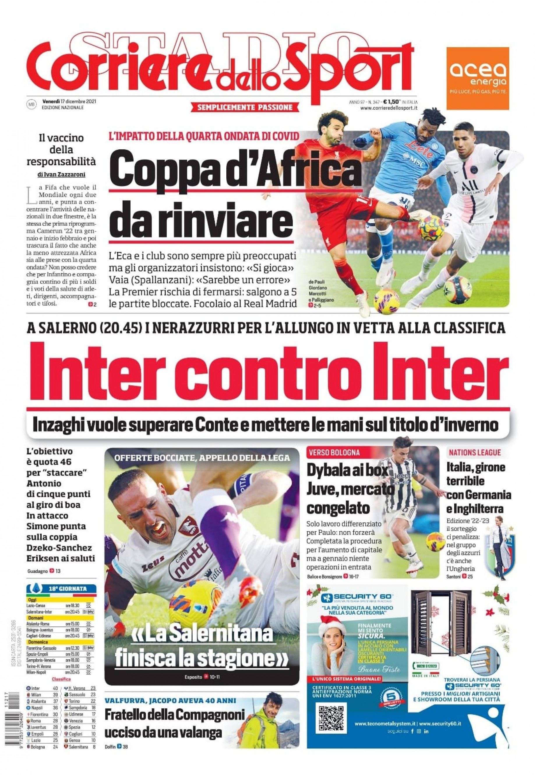 Il Corriere dello Sport apre in prima pagina con l'anticipo dell'Inter contro la Salernitana: "Inter contro Inter. Inzaghi vuole superare Conte e mettere le mani sul titolo d'inverno". In taglio alto spazio alla "Coppa d'Africa da rinviare". Al centro la Juventus: "Dybala ai box. Juve, mercato congelato". Al centro la situazione societaria della Salernitana e sulla destra i sorteggi di Nations League, per l'Italia è un "girone terribile con Germania e Inghilterra".