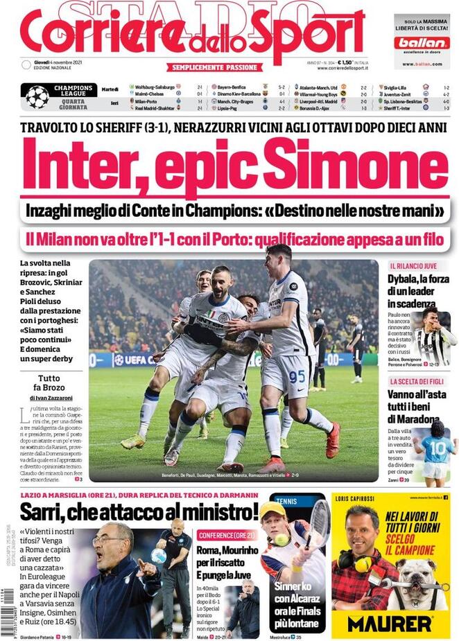Nell'edizione di oggi, il Corriere dello Sport, apre in prima pagina con la vittoria dell'Inter di Inzaghi in Champions League: "Inter, epic Simone. Travolto lo Sheriff (3-1), nerazzurri vicini agli ottavi dopo dieci anni". A centro pagina spazio al pari del Milan a San Siro: "Il Milan non va oltre l'1-1 con il Porto: qualificazione appesa a un filo". In taglio basso spazio a Lazio e Napoli impegnate oggi in Europa League: "Sarri, che attacco al ministro!". Di spalla spazio alla scelta degli eredi di Diego Armando Maradona: "Vanno all'asta tutti i beni di Maradona".