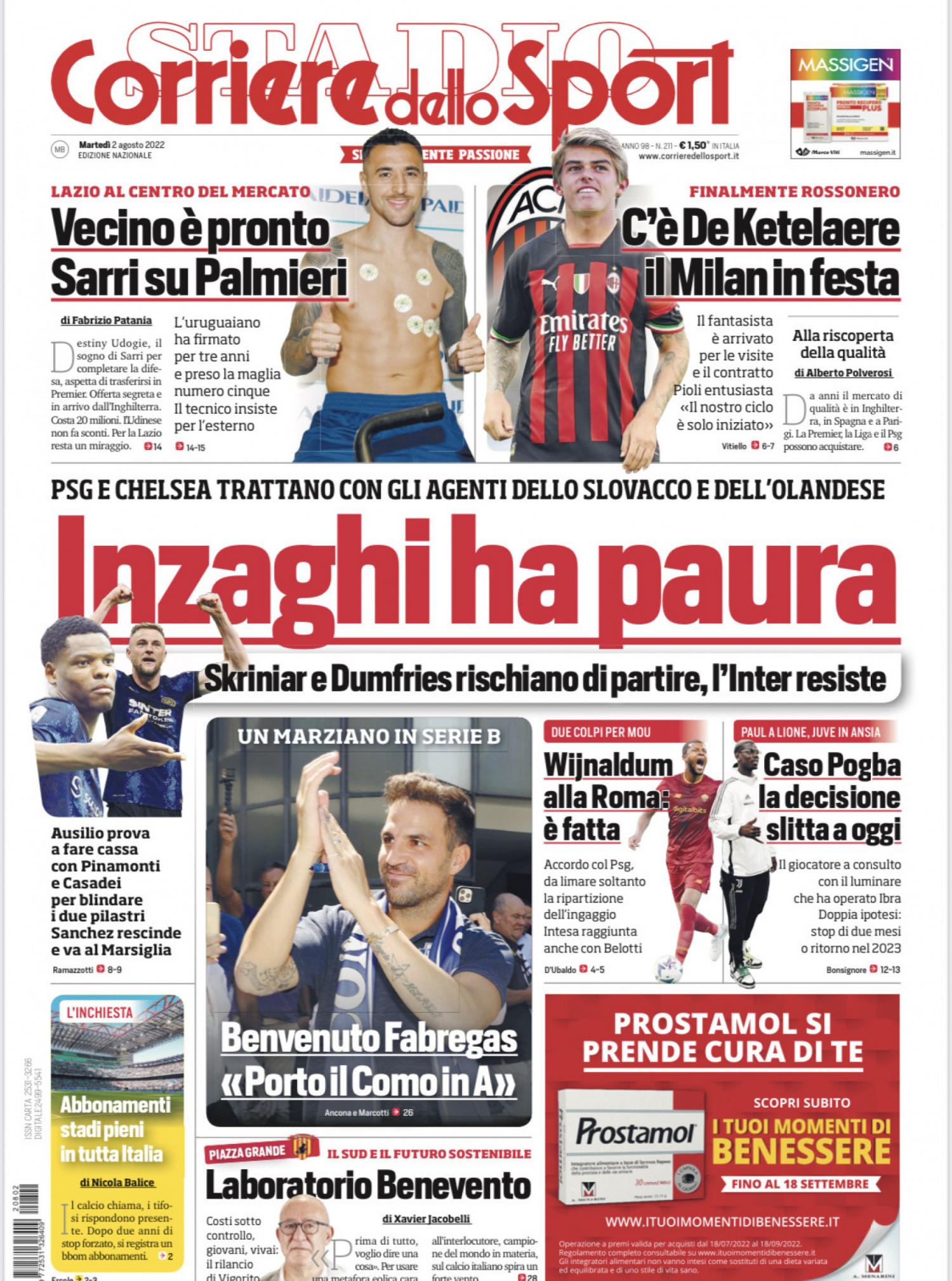 Il Corriere dello Sport apre in prima pagina con il mercato in casa Inter: "Inzaghi ha paura. Skriniar e Dumfries rischiano di partire, l'Inter resiste". In taglio alto spazio alla Lazio: "Vecino è pronto. Sarri su Palmieri". Sempre in taglio alto il Milan: "C'è De Ketelaere, il Milan in festa". Di spalla spazio alla Roma: "Wjnaldum alla Roma è fatta". Si parla anche della Juventus: "Caso Pogba, la decisione slitta a oggi". In taglio basso c'è il Como: "Benvenuto Fabregas: 'Porto il Como in A'".