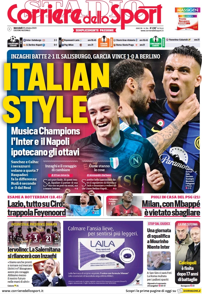 Nell'edizione odierna, il Corriere dello Sport apre in prima pagina con le vittorie in Champions di Napoli e Inter: "Italian style. Musica Champions, l'Inter e il Napoli ipotecano gli ottavi". A centro pagina spazio alle altre due italiane impegnate in Champions League stasera: "Lazio, tutto su Ciro: trappola Feyenoord". "Milan, con Mbappé è vietato sbagliare".