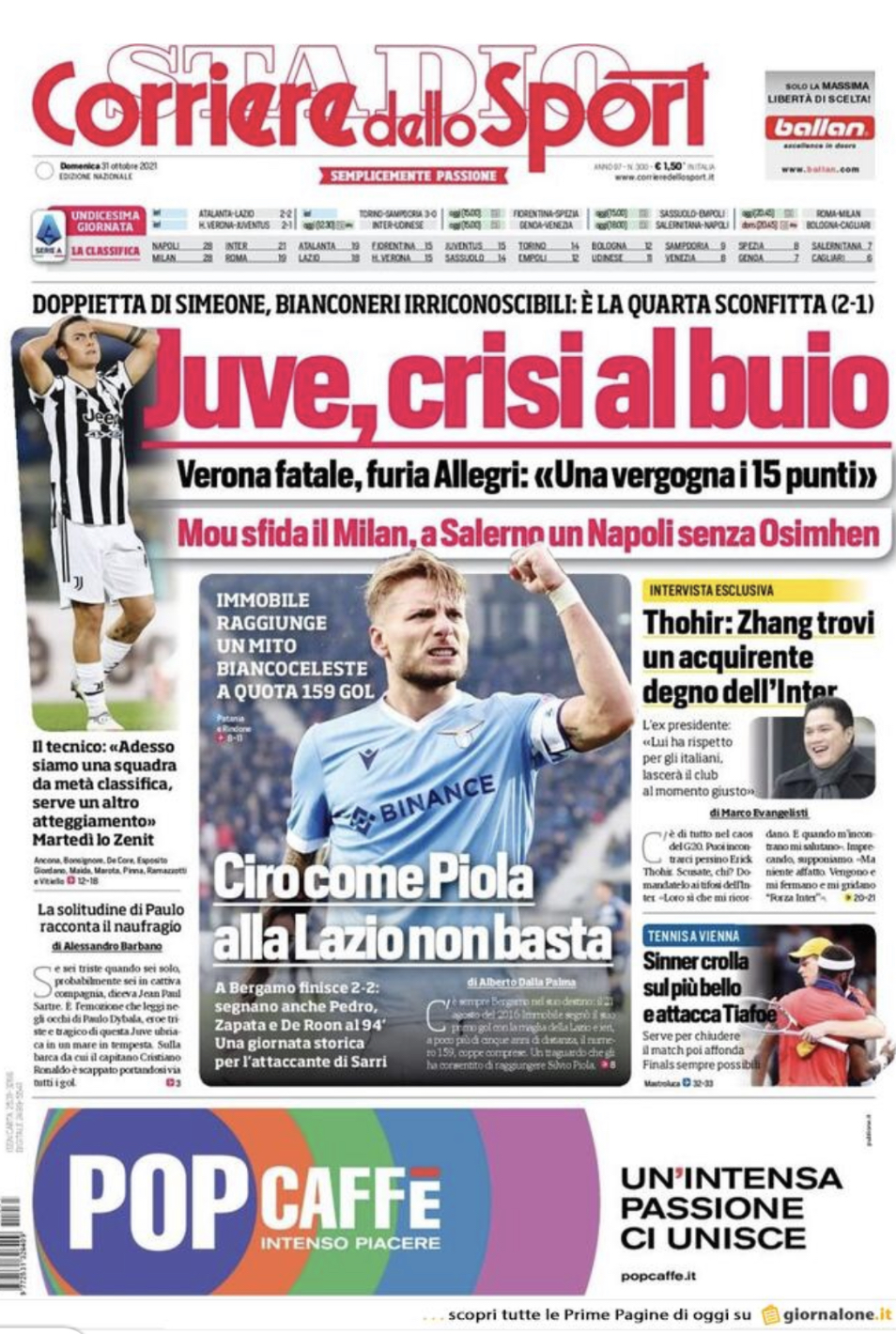 Nell'edizione di oggi il Corriere dello Sport apre in prima pagina col secondo ko consecutivo della Juventus in campionato: "Juve, crisi al buio. Verona fatale, furia: Allegri: 'Una vergogna i 15 punti'". A centro pagina spazio al pareggio tra Atalanta e Lazio e al record di gol di Immobile in maglia biancoceleste: "Ciro come Piola alla Lazio non basta". A centro pagina spazio alle gare che aspettano Napoli e Milan oggi: "Mou sfida il Milan, a Salerno un Napoli senza Osimhen".
