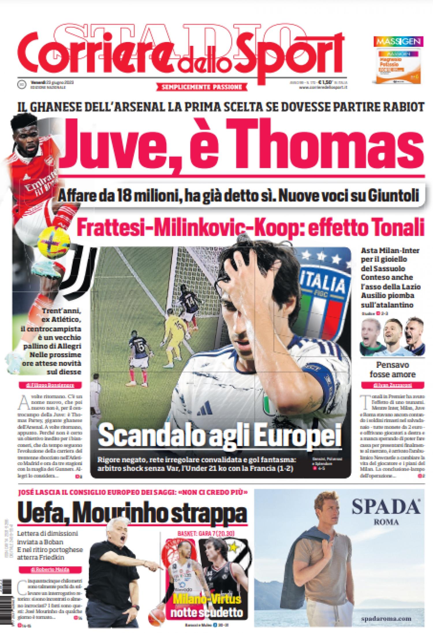 Nell'edizione di oggi, il Corriere dello Sport apre in prima pagina con un probabile acquisto della Juventus Thomas Partey: "Juve, è Thomas. Affare da 18 milioni, ha giù detto sì. Nuove voci su Giuntoli". A centro pagina spazio anche all'esordio sfortunato dell'Italia Under 21: "Scandalo agli Europei". In taglio basso la decisione presa da Mourinho: "Uefa, Mourinho strappa".