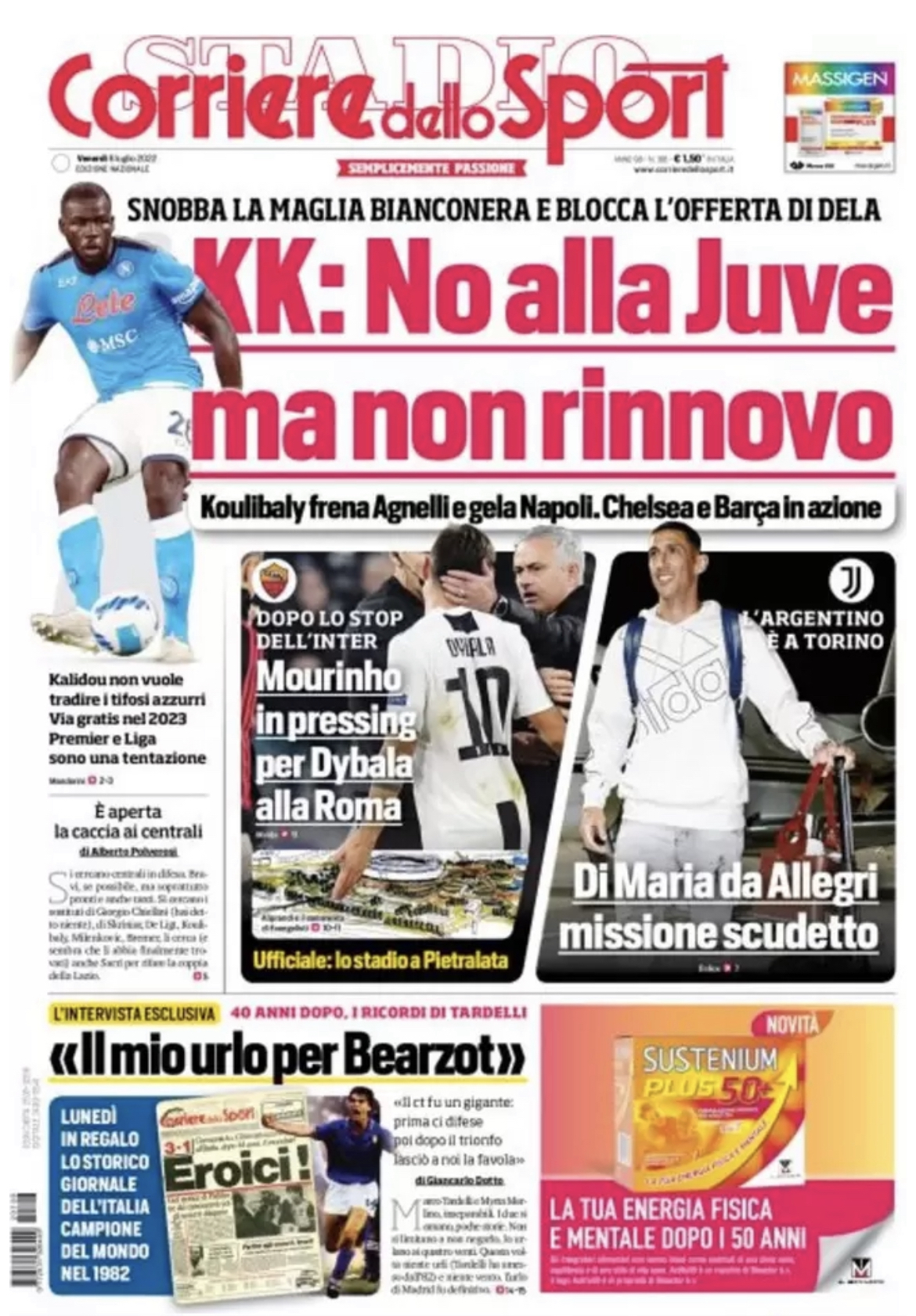 Il Corriere dello Sport apre in prima pagina con il futuro di Koulibaly: “KK: no alla Juve ma non rinnovo. Snobba la maglia bianconera ma blocca l'offerta di DeLa. Koulibaly frena Agnelli e gela Napoli. Chelsea e Barcellona in azione. Kalidou non vuole tradire i tifosi azzurri. Via gratis nel 2023: Premier o Liga sono una tentazione". Al centro si parla della Roma: "Mourinho in pressing per Dybala alla Roma". Spazio anche all'arrivo a Torino di Di Maria.