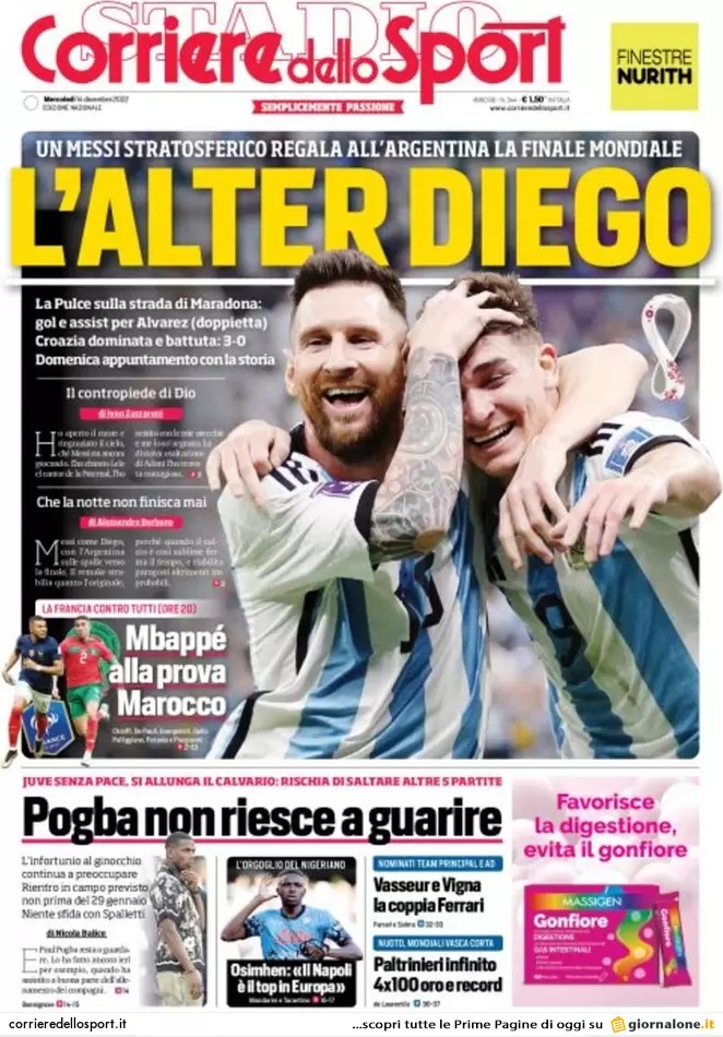 Nell'edizione di oggi, il Corriere dello Sport apre in prima pagina con la vittoria dell'Argentina di Messi, che piega la Croazia e vola alla finale dei Mondiali: "L'alter Diego. Un Messi stratosferico regala all'Argentina la finale Mondiale". Più in basso spazio all'altra semifinale, in programma stasera: "Mbappé alla prova Marocco". In taglio basso i guai fisici del centrocampista della Juventus: "Pogba non riesce a guarire. Niente sfida con Spalletti. Nel box in basso le parole di Victor Osimhen rilasciate in un'intervista sul web: "Il Napoli è il top in Europa".