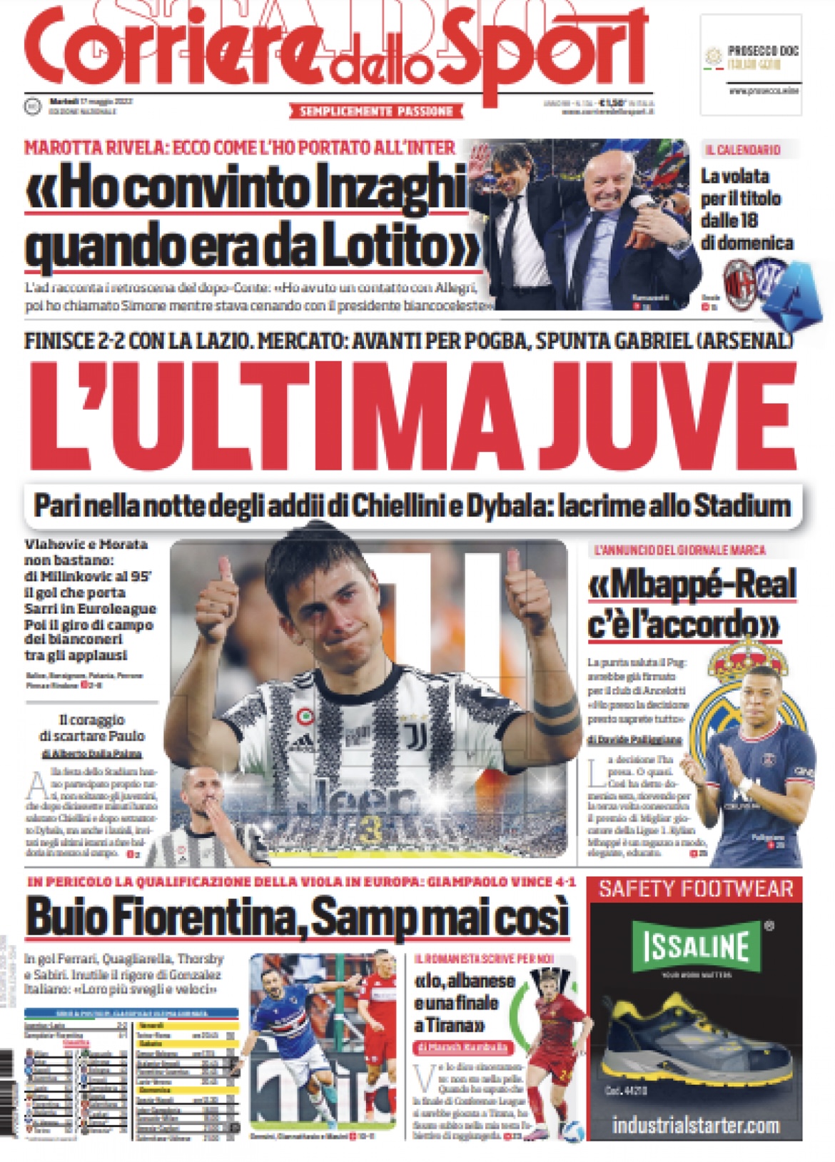 Il Corriere dello Sport apre in prima pagina con l’ultima partita allo Stadium di Chiellini e Dybala: “L’ultima Juve. Finisce 2-2 con la Lazio. Mercato: avanti per Pogba, spunta Gabriel (Arsenal). Pari nella notte degli addi di Chiellini e Dybala: lacrime allo Stadium". In taglio alto il retroscena che ha coinvolto il trio Inzaghi-Marotta e Lotito. E secondo Marca c'è l'accordo Mbappé-Real. In basso il crollo della Fiorentina contro la Sampdoria.