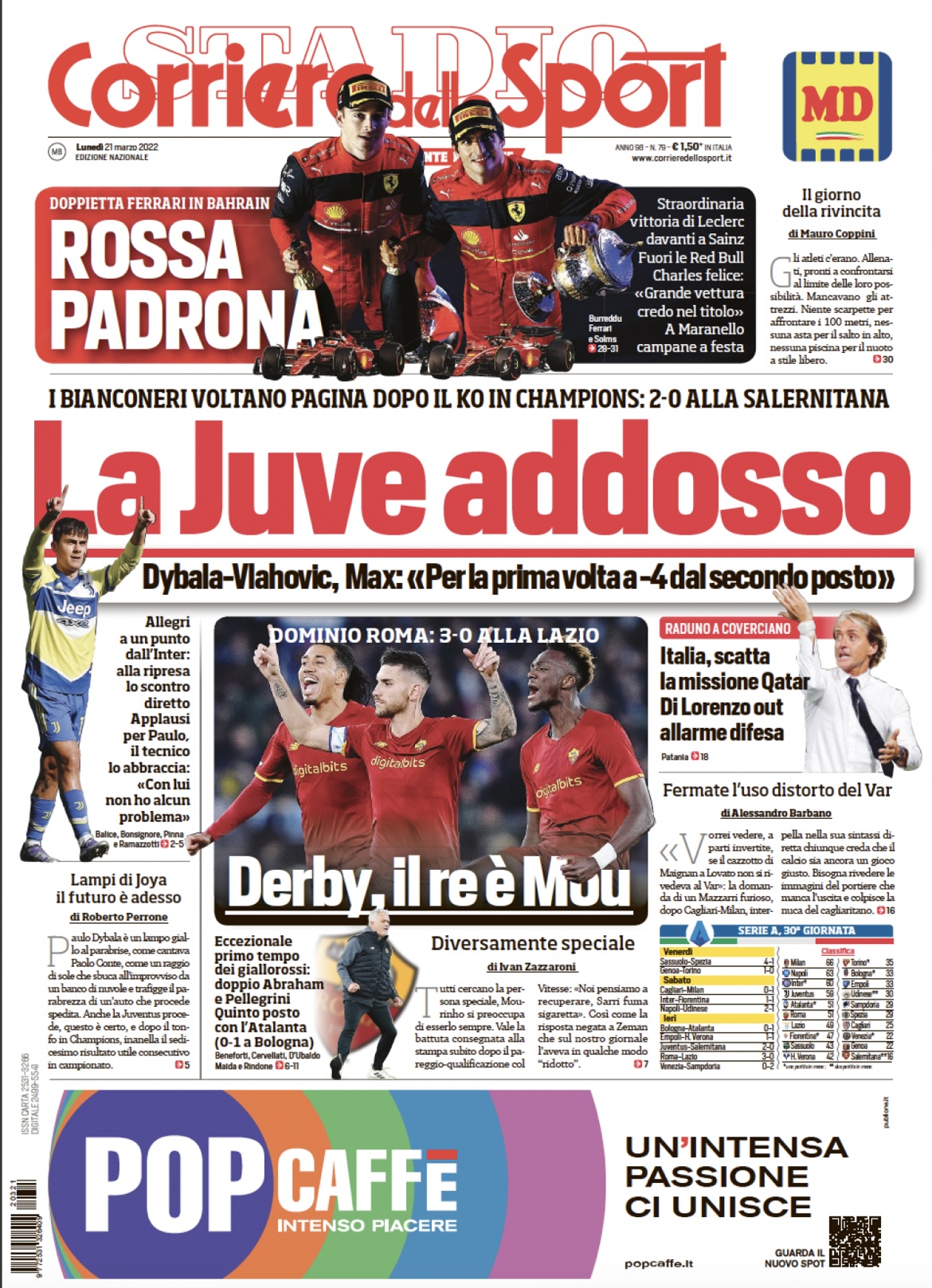 Il Corriere dello Sport apre in prima pagina con la corsa scudetto e la vittoria della Juventus, ora a -1 dall'Inter terza: "La Juve addosso. I bianconeri voltano pagina dopo il ko in Champions: 2-0 alla Salernitana". Al centro spazio alla Roma: "Derby, il re è Mou". Sulla destra si parla della Nazionale: "Italia, scatta la missione Qatar. Di Lorenzo out, è allarme difesa".