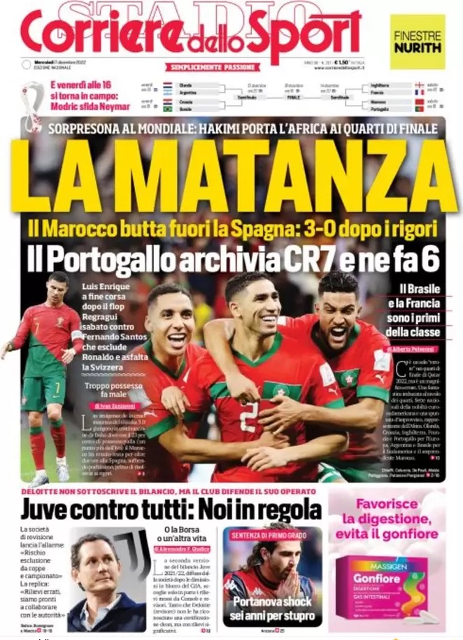 Nell'edizione di oggi, il Corriere dello Sport apre in prima pagina con gli ultimi due ottavi di finale ai Mondiali in Qatar: "La matanza. Il Marocco butta fuori la Spagna: 3-0 dopo i rigori. Il Portogallo archivia CR7 e ne fa 6". In taglio basso il caso Juventus, con il club bianconero che difende il proprio operato: "Juve contro tutti: Noi in regola". Sempre in taglio basso la sentenza che accusa il calciatore del Genoa: "Portanova shock: sei anni per stupro".