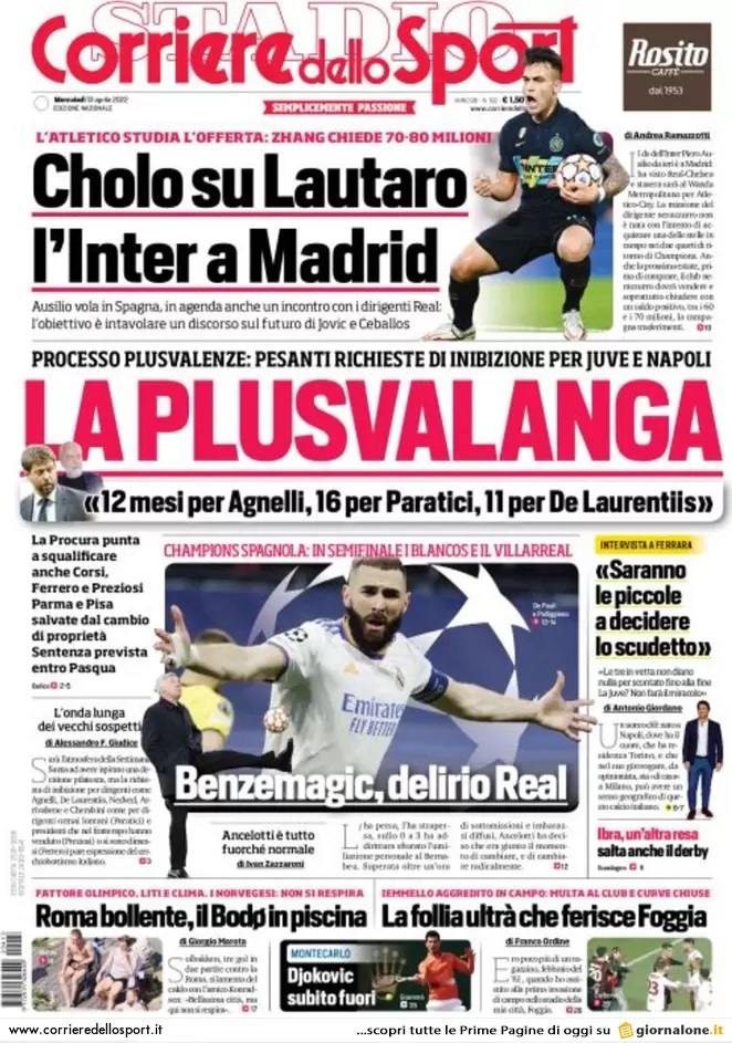 Il Corriere dello Sport, nell'edizione di oggi, apre in prima pagina con il caso plusvalenze: "La plusvalanga. Processo plusvalenze, pesanti richieste di inibizione per Juve e Napoli. 12 mesi per Agnelli, 16 per Paratici, 11 per De Laurentiis". In taglio alto la bomba di mercato con l'Atletico Madrid che si fionda su Lautaro Martinez: "Cholo su Lautaro, L'Inter a Madrid". A centro pagina spazio al Real Madrid che vola in semifinale di Champions League: "Benzemagic, delirio Real".