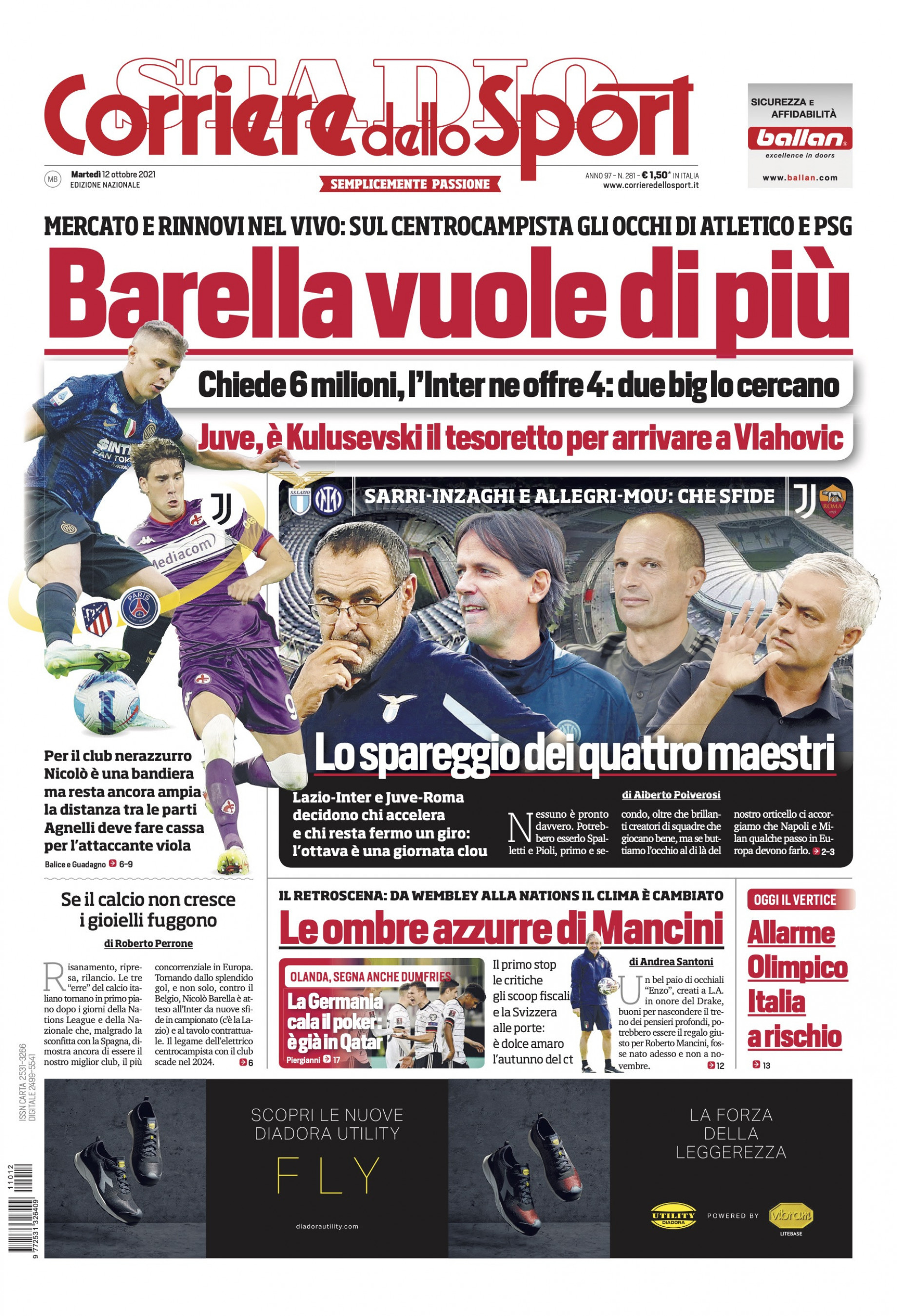 Il Corriere dello Sport apre in prima pagina con i due scontri diretti che previsti nella prossima giornata di Serie A: "Lo spareggio dei quattro maestri. Lazio-Inter e Juve-Roma decidono chi accelera e chi resta fermo per un giro: l'ottava è una giornata clou". In taglio alto ampio spazio alle trattative dei rinnovi a partire da quella relativa a Barella: "Barella vuole di più. Chiede 6 milioni, l'Inter ne 4: due big lo cercano. Juve, è Kulusevski il tesoretto per arrivare a Vlahovic". In basso la Nazionale: "Le ombre azzurre di Mancini".