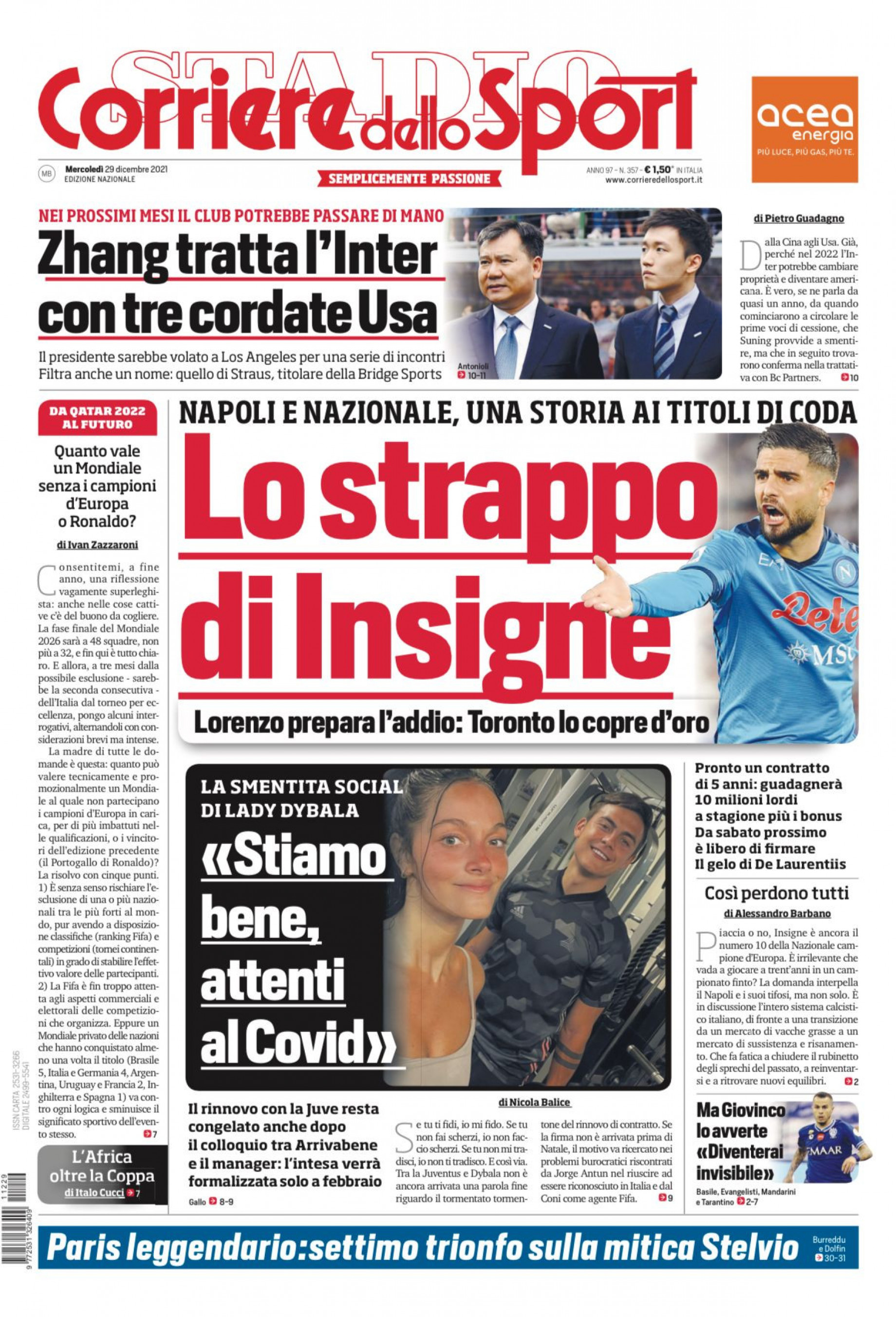 "Lo strappo di Insigne", titola così il Corriere dello Sport in prima pagina nell'edizione di oggi. "Napoli e Nazionale, una storia ai titoli di coda. Lorenzo prepara l'addio: Toronto lo copre d'oro. Pronto un contratto di 5 anni: guadagnerà 10 milioni lordi a stagione più bonus. Da sabato prossimo è libero di firmare, il gelo di De Laurentiis". In taglio alto spazio al possibile cambio di proprietà dell'Inter: "Zhang tratta l'Inter con tre cordate Usa". A centro pagina spazio alla smentita via social della compagna di Dybala: "Stiamo bene, attenti al Covid".