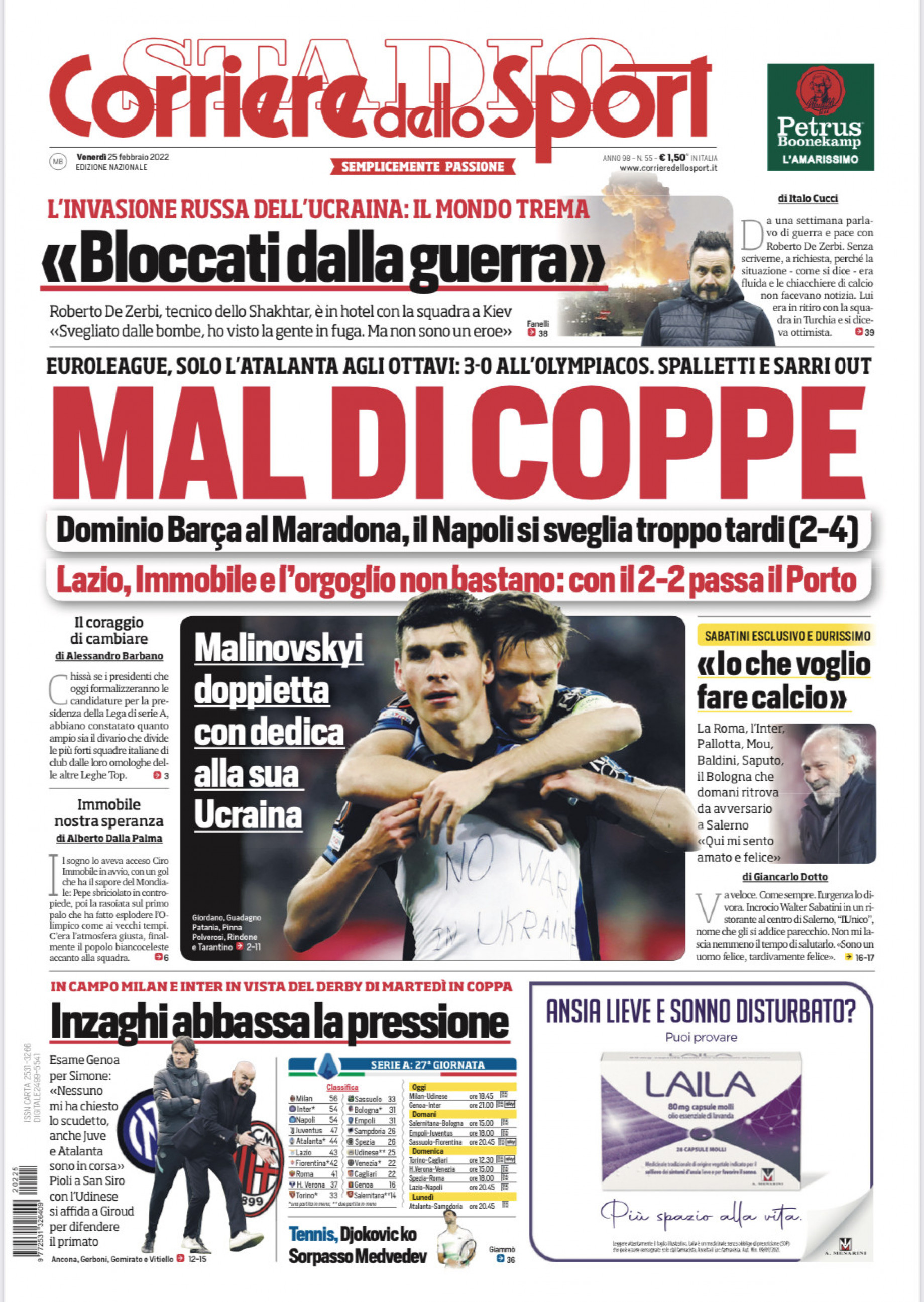 Nell'edizione di oggi il Corriere dello Sport apre in prima pagina con le eliminazioni dall'Europa League di Napoli e Lazio: "Mal di coppe. Dominio Barça al Maradona, il Napoli si sveglia troppo tardi (2-4). Lazio, Immobile e l'orgoglio non bastano: con il 2-2 passa il Porto". A centro pagina spazio a Malinovskyi, che firma una doppietta che qualifica l'Atalanta e manda un messaggio alla sua nazione in guerra: "Malinovskyi, doppietta con dedica alla sua Ucraina". In taglio basso spazio alle milanesi, di nuovo in campo in campionato prima del derby di Coppa Italia: "Inzaghi abbassa la tensione".