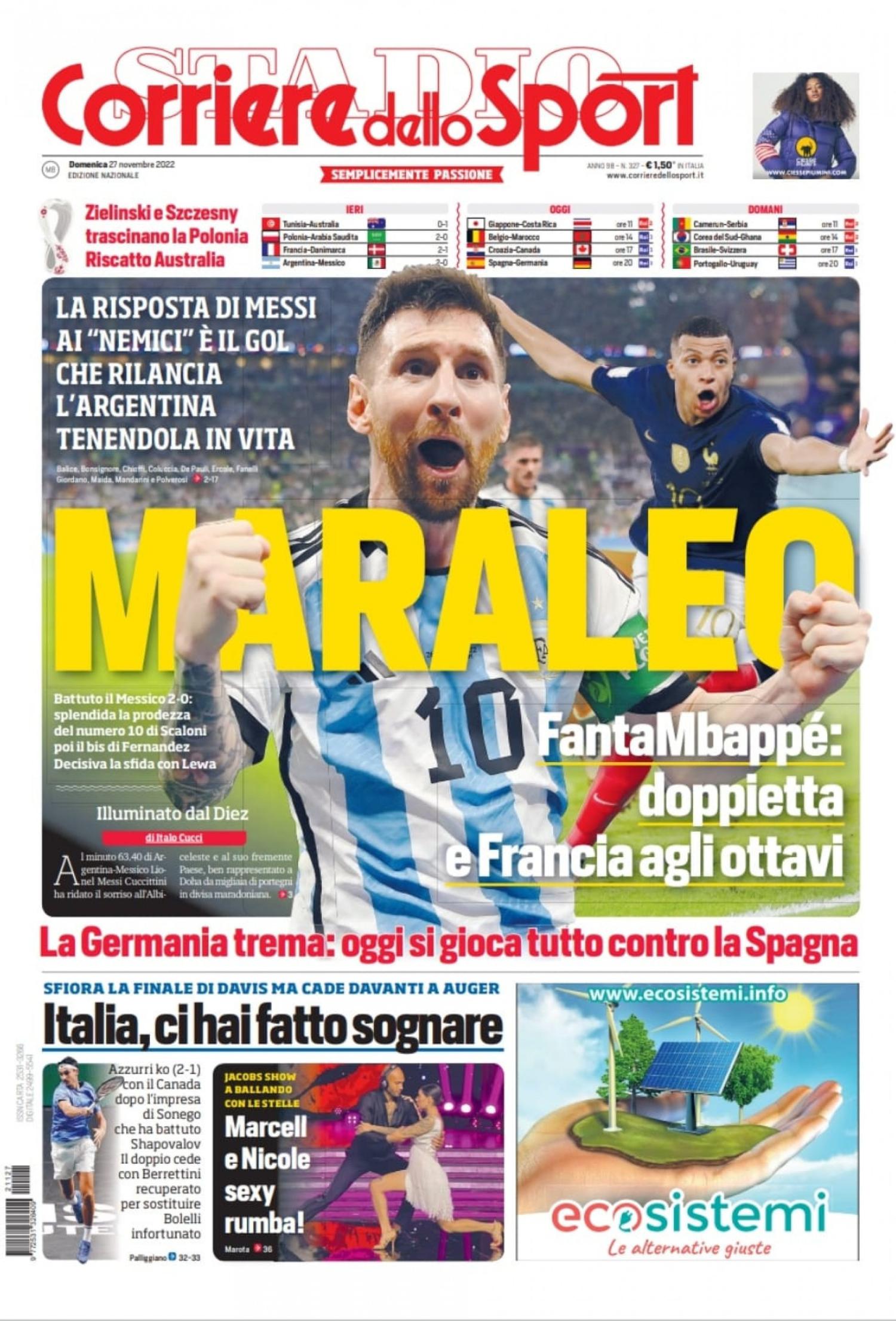 Nell'edizione di oggi il Corriere dello Sport apre con le vittorie di Argentina e Francia ai Mondiali in Qatar: "MaraLeo. FantaMbappé: doppietta e Francia agli ottavi". A centro pagina spazio alle gare di Qatar 2022 di oggi: "La Germania trema: oggi si gioca tutto contro la Spagna". In taglio basso l'impresa sfiorata dall'Italia in Coppa Davis: "Italia, ci hai fatto sognare".