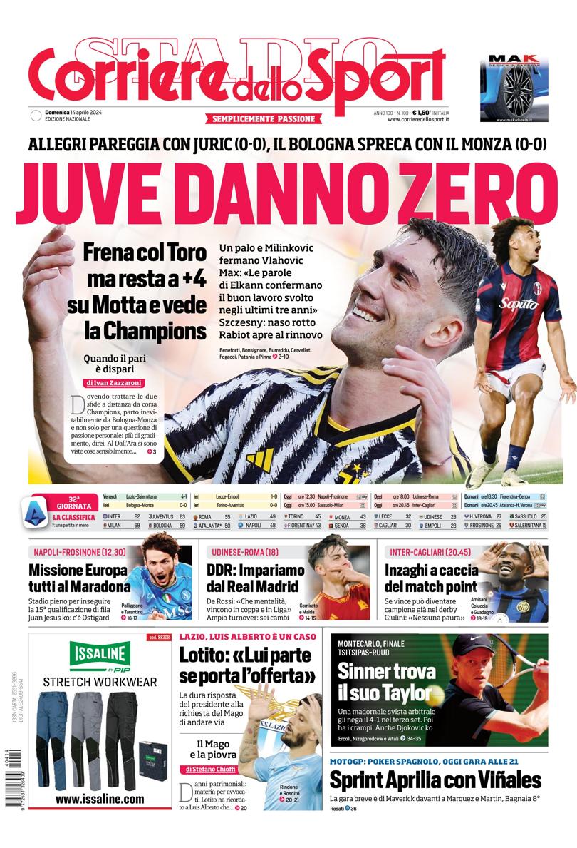 “Missione Europa: tutti al Maradona”. Titola così in taglio basso l’edizione odierna del Corriere dello Sport: "Stadio pieno per inseguire la 15a qualificazione di fila. Juan Jesus ko: c'è Ostigard". Al centro lo 0-0 nel derby della Mole e il pareggio a reti bianche del Bologna: "Juve danno zero. Frena col Toro ma resta a +4 su Motta e vede la Champions. Allegri pareggia con Juric. Il Bologna spreca con il Monza". Spazio anche a Roma e Inter e alle parole del presidente della Lazio Claudio Lotito su Luis Alberto.