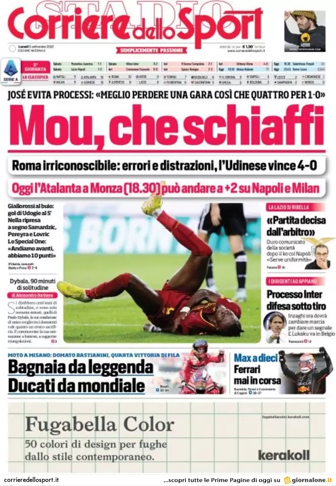 Nell'edizione di oggi il Corriere dello Sport apre in prima pagina con l'incridibile ko della Roma a Udine: "Mou, che schiaffi. Roma irriconoscibile: errori e distrazioni, l'Udinese vince 4-0". A centro pagina spazio all'Atalanta impegnata oggi nel derby lombardo: "Oggi l'Atalanta a Monza (18.30) può andare a +2 su Napoli e Milan". Di spalla le lamentele della Lazio per l'arbitraggio dopo il ko interno col Napoli: "Partita decisa dall'arbitro".