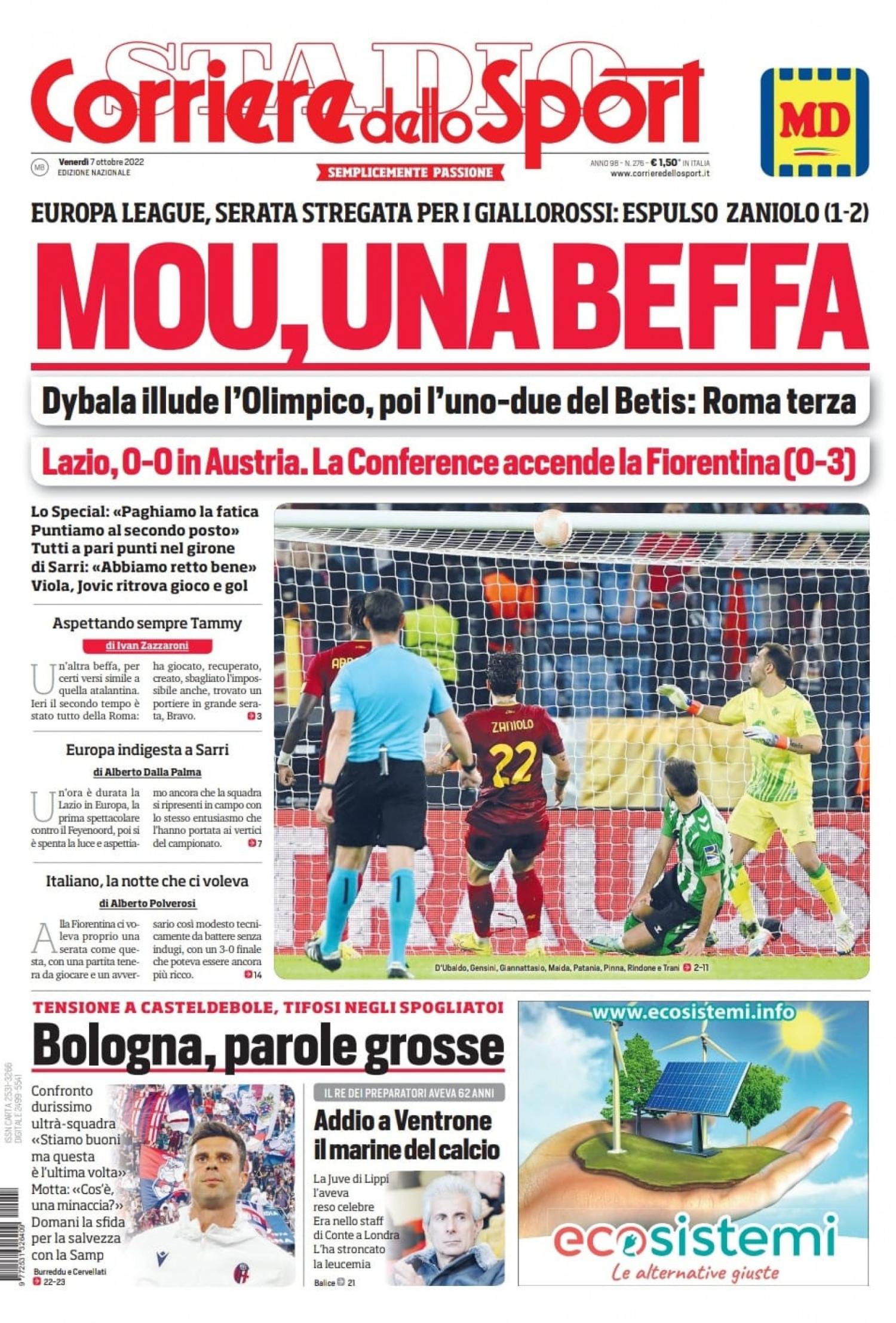 “Mou, una beffa”. Titola così in prima pagina l’edizione odierna del Corriere dello Sport, in riferimento alla sconfitta della Roma in Europa League. Al centro spazio anche alla Lazio e alla Fiorentina. In taglio basso spazio anche al Bologna: "Bologna, parole grosse" e alla morte di Ventrone: "Addio a Ventrone, il marine del calcio".